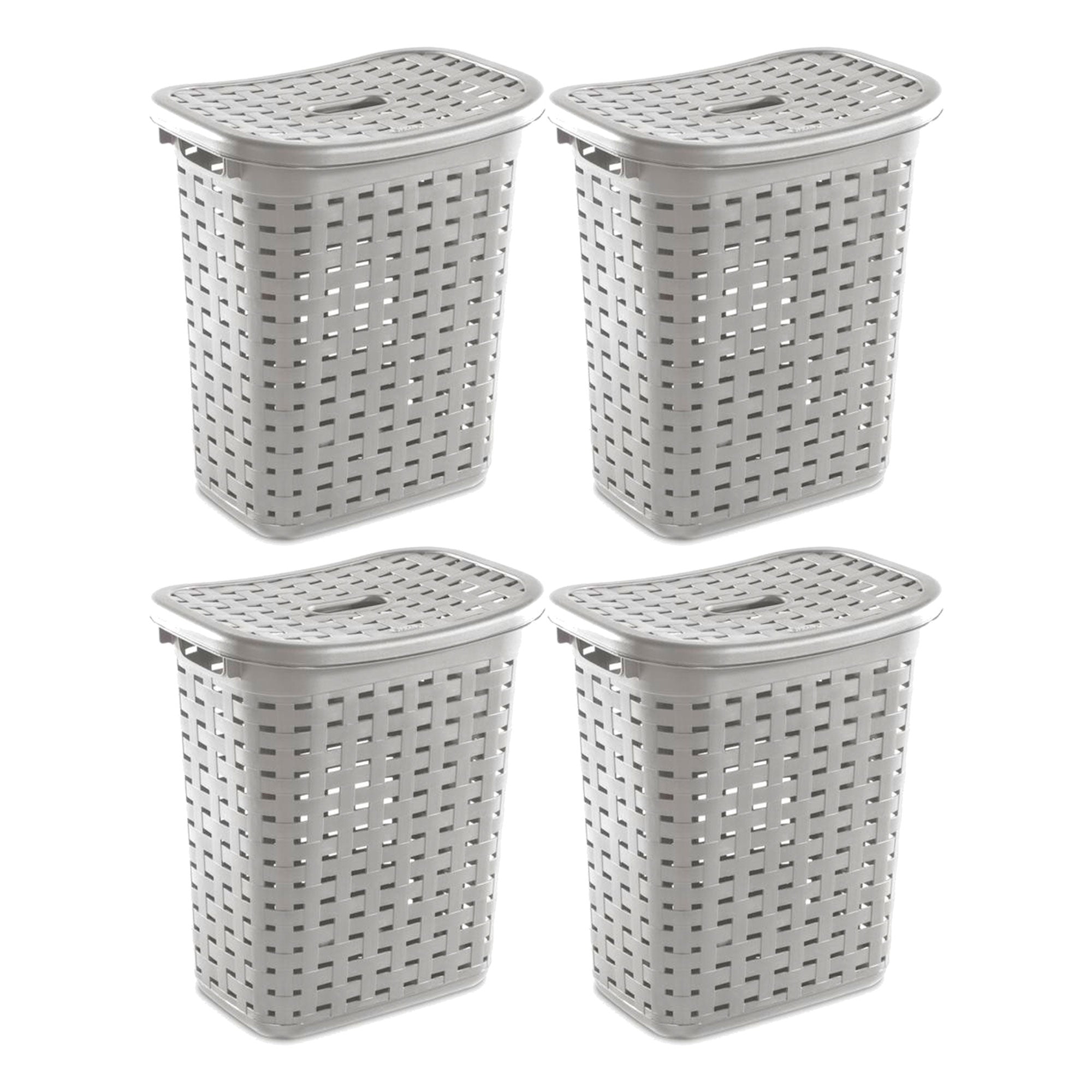 - Includes 4 plastic wicker-style weave laundry baskets with lids allowing you to keep clothes contained and out of sight