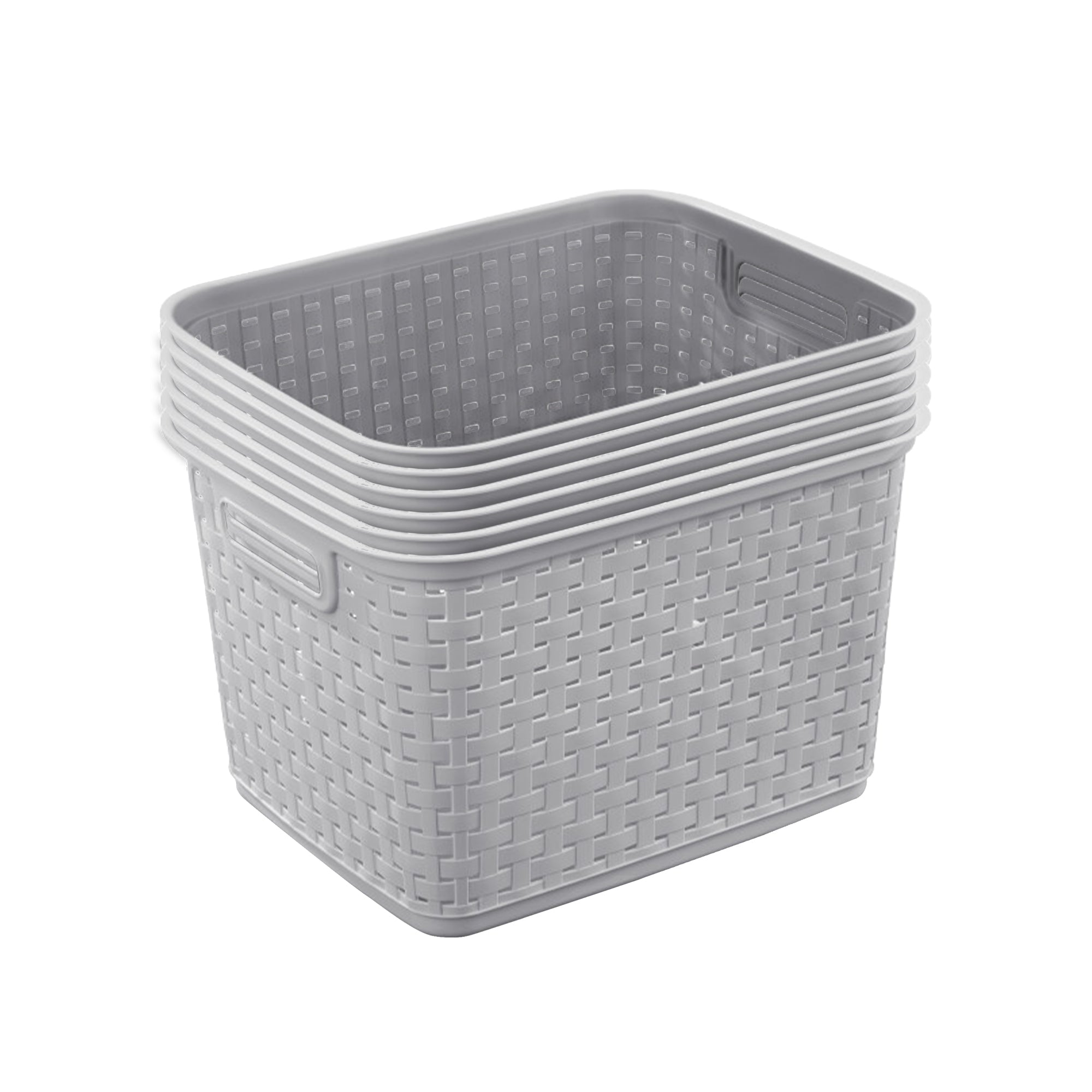 With a woven design that looks just like real wicker, this basket's attractive form and neutral cement gray color make it great for complimenting a wide variety of decors as a functional storage solution. Tidy up the living room or your laundry room with a wicker laundry basket that adds a fashionable touch to your most heavily used spaces. With 15 x 12.25 x 9.375 inches of space, carrying handles, and easy to clean plastic construction, this basket bin gets the job done on your counter tops, in your pantry, on your bookshelves, and elsewhere.
