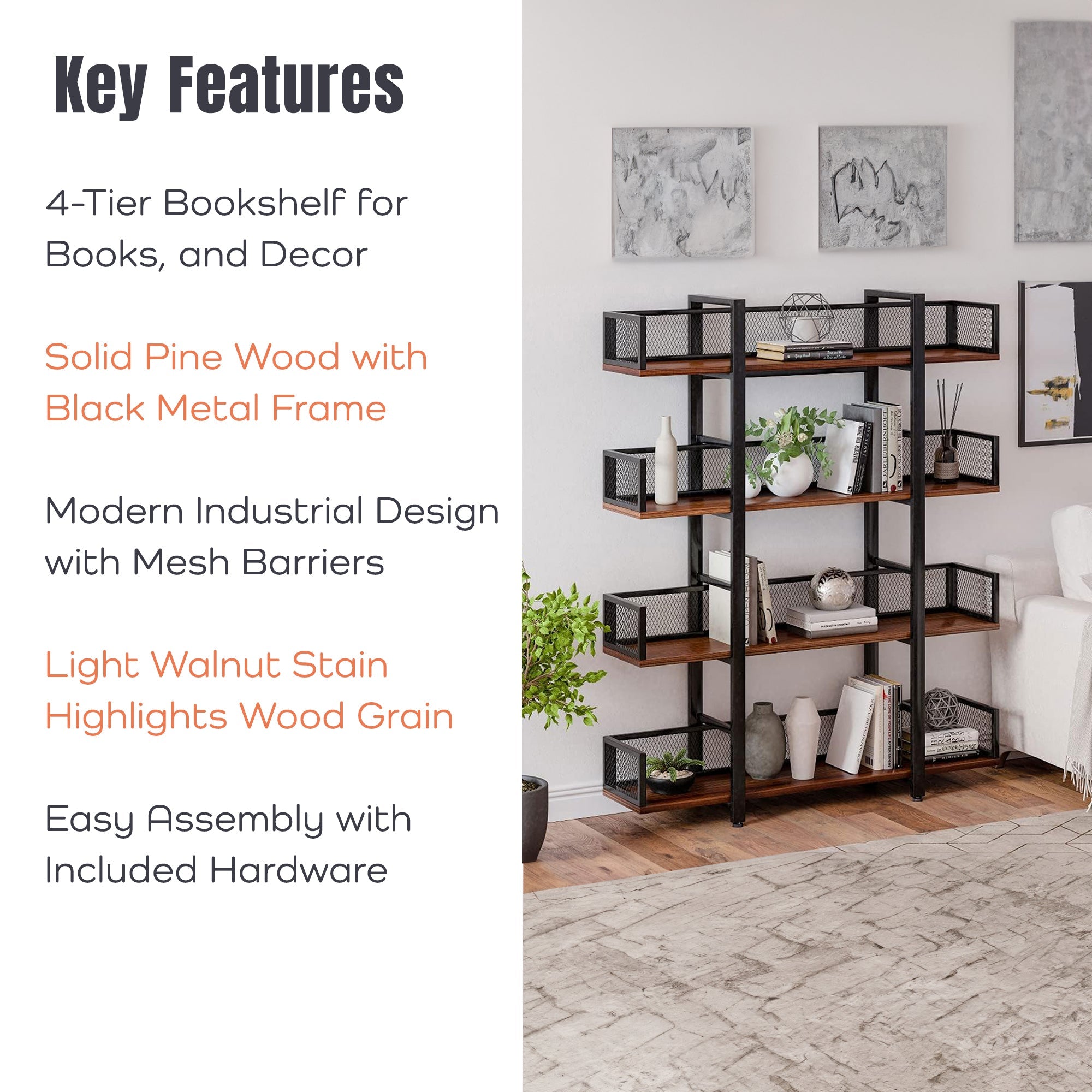 Sturdis 4 Tier Solid Wood Metal Industrial Bookshelf with Mesh Barriers, Black