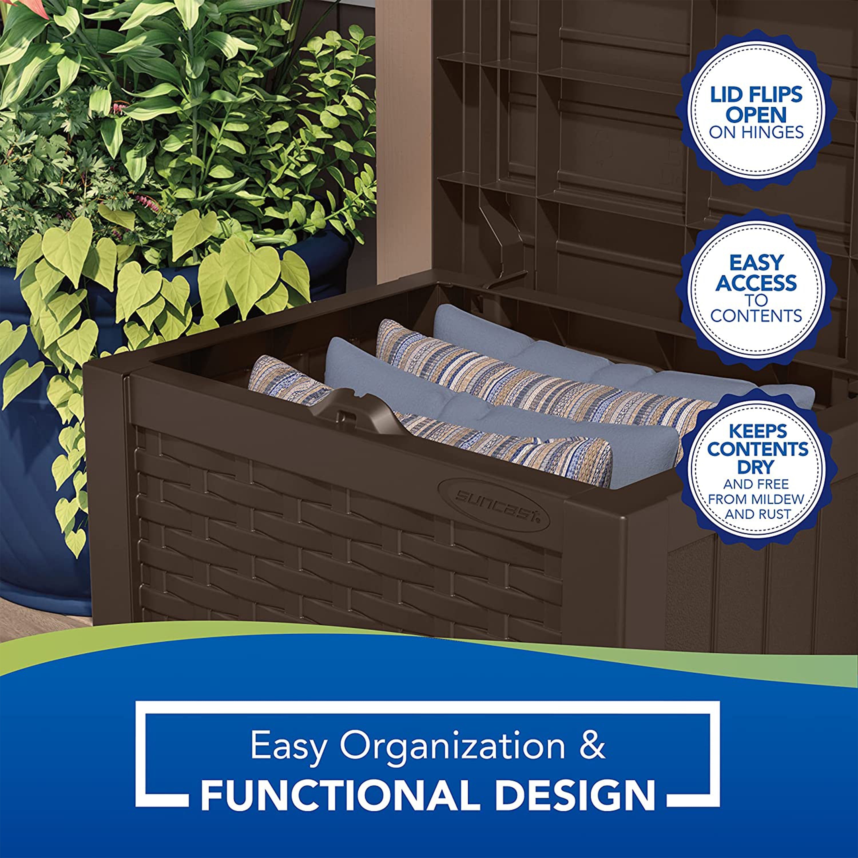 Keep your outdoor space neat, tidy, and stylish with the Suncast 22 Gallon Indoor Outdoor Patio Storage Chest Box and Seat in Java.