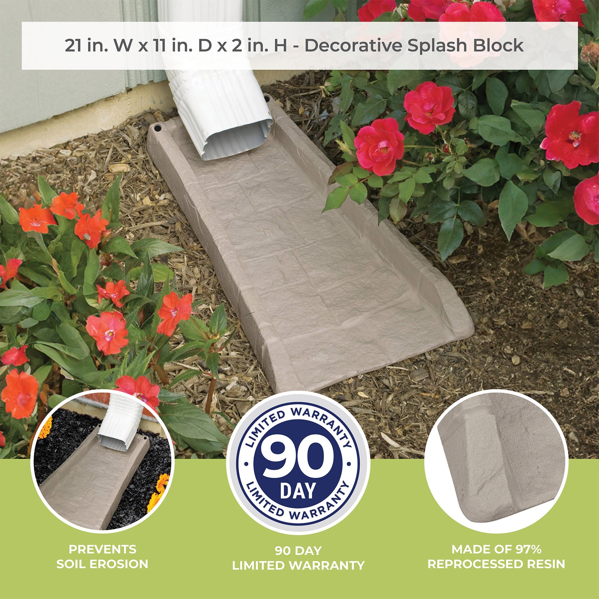 Direct rainwater away from the foundation of your house with this Suncast SB24 decorative gutter downspout splash block. Help keep edgings where they need to be and prevent soil erosion. The splash block directs rain water away from foundation so that area is kept safe and dry. The downspout also prevents mud from splattering on the side of your home, so your exterior can remain in pristine condition.