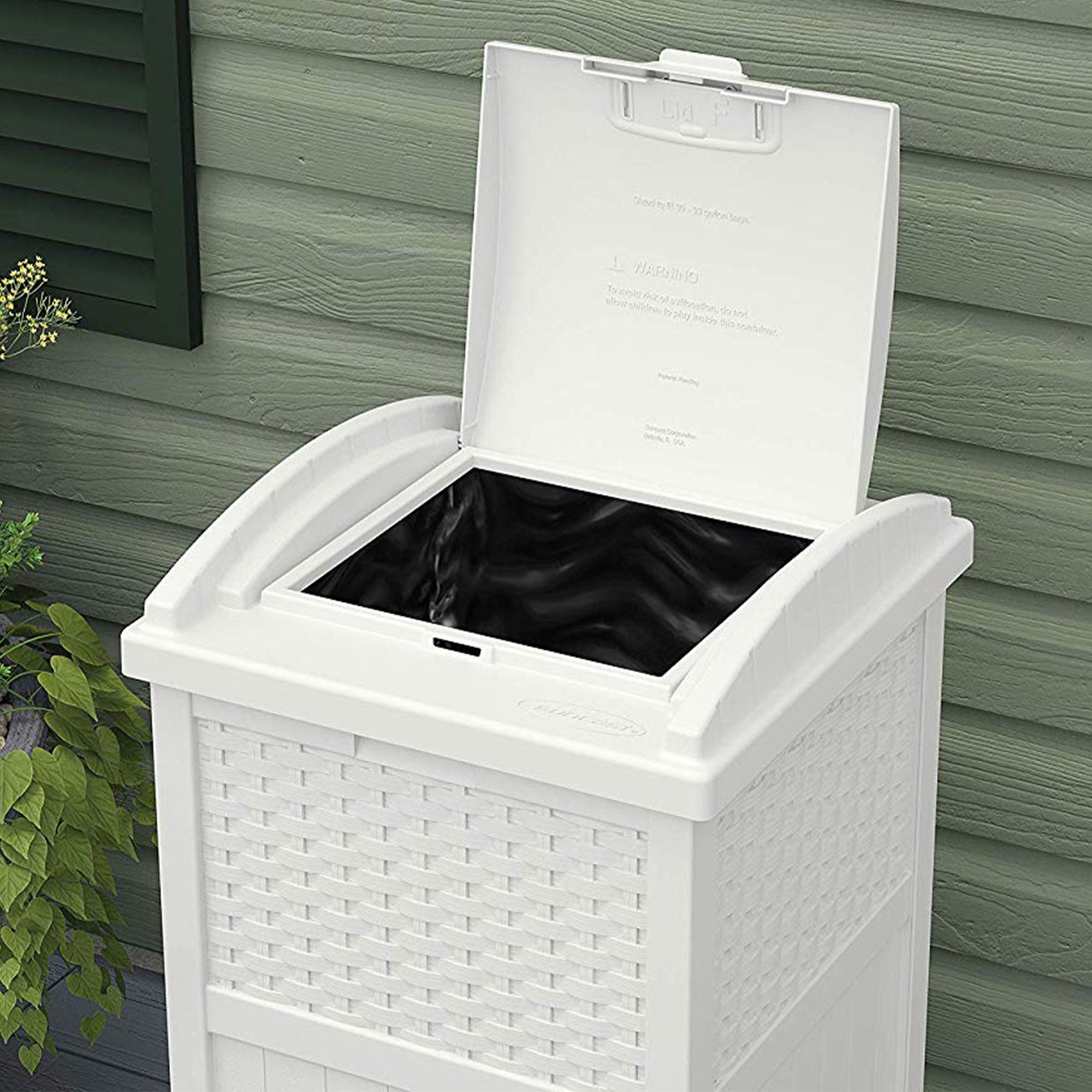 Constructed of durable material for a strong and stay-dry exterior, these hideaway trash bins can hold between 30 to 33-gallon trash bags. They feature a stylish wicker design that's not only practical but looks good too. The sturdy base won't tip over easily during storms or during periods of high wind, while the material helps keep the can dry all year long.