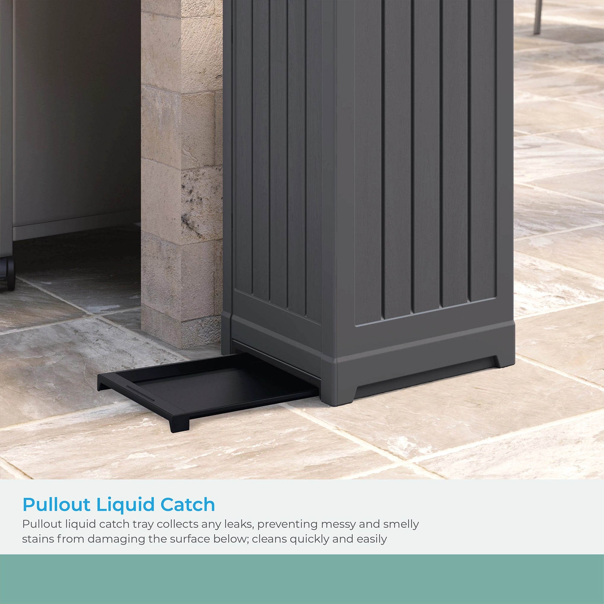 Bring unmatched functionality to your patio space and take advantage of features included to make your life easier. The double-latching lid conceals tossed-away refuse or recycled items to keep your yard clean all year long. This deck box is the ideal cleanup solution for your home and yard, featuring a pullout tray for catching liquids and a trash bag roll holder for quick access when replacing bags. With the comfortable grip handles, you’ll enjoy effortless mobility to enhance any outdoor space.