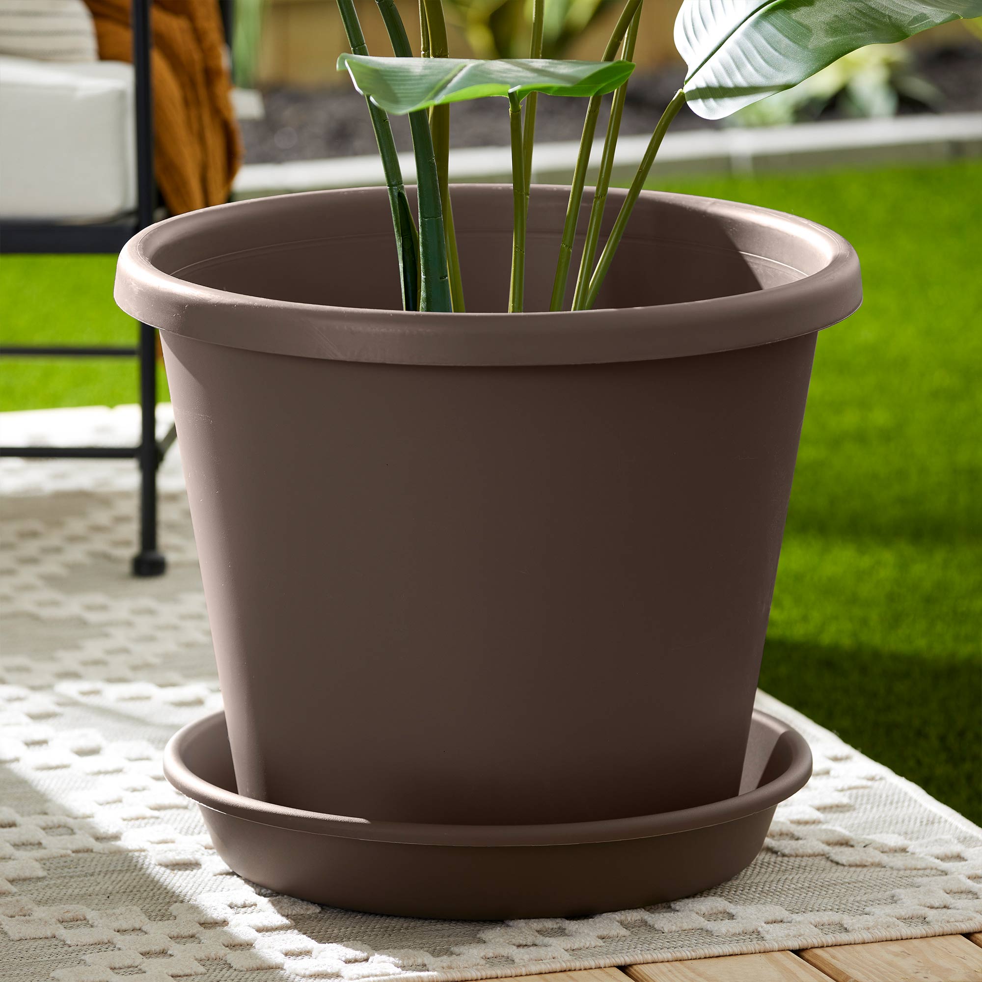Measuring 21 inches in diameter, this round flower pot saucer is specifically crafted to accommodate round flower pots with matching 21-inch base diameters. Its interior features ridges that elevate the flower pot, facilitating moisture drainage, while the high sides effectively contain excess moisture. Moreover, the saucer is equipped with removable drain plugs for easy disposal of excess water. Ideal for both indoor and outdoor use, its classic design seamlessly complements various indoor decors, ranging from farmhouse to modern aesthetics. Crafted from durable yet lightweight plastic, this saucer is built to withstand wear and tear, ensuring resistance against color fading, leaking, and cracking, making it a reliable choice for both indoor and outdoor settings.