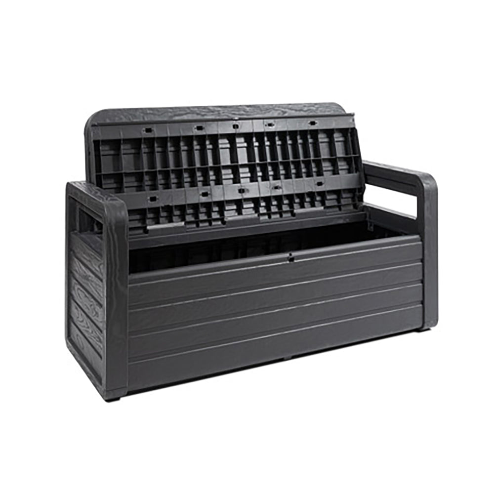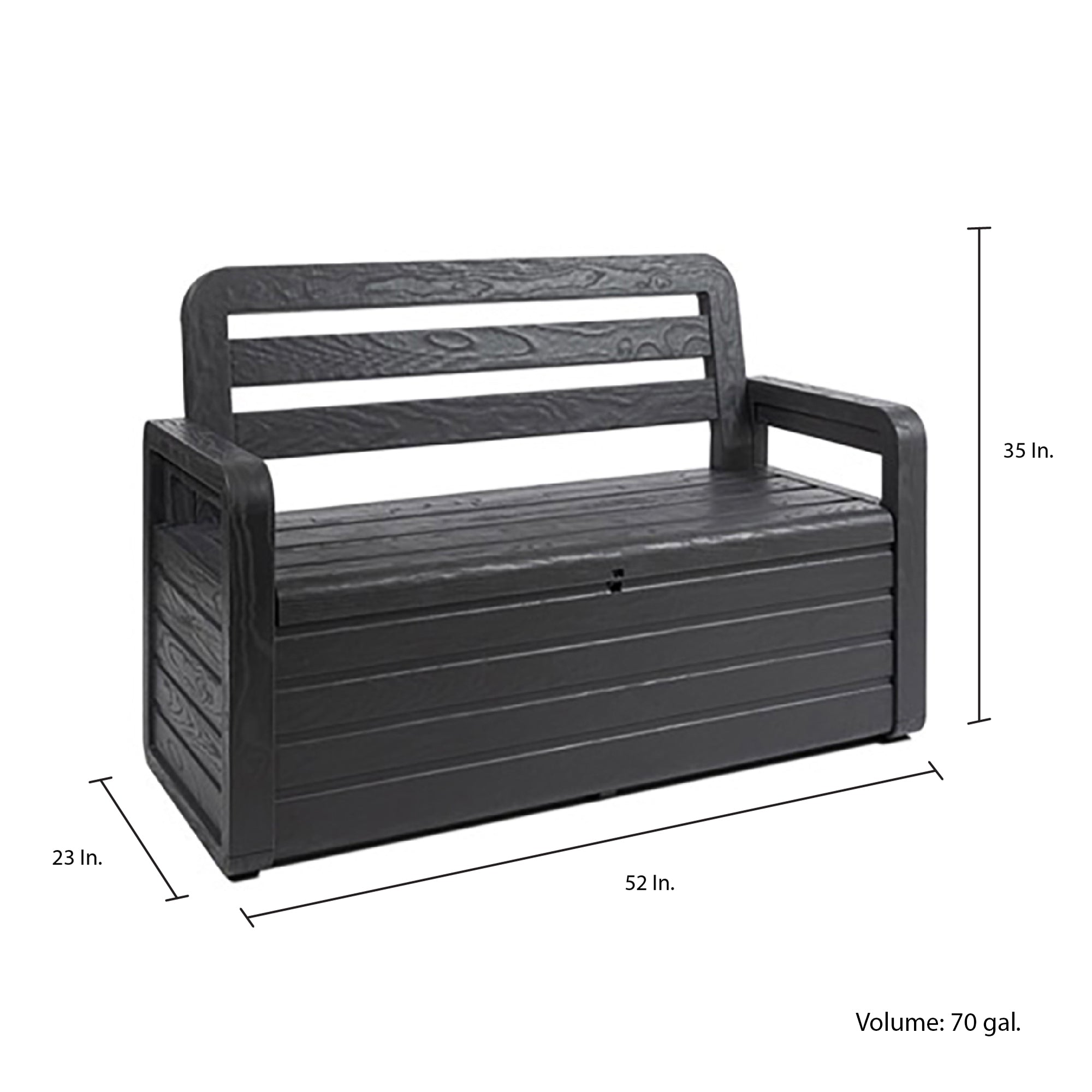 The 70-gallon deck box is both versatile and attractive. Great for convenient outdoor storage, this storage bench enables you to safely keep outdoor entertaining items close to where they will be used on the patio or deck. Let your children grab their pool items and head off to play. Take a seat on top and chill out in the sun. The bench back allows 2 to lean back and relax comfortably. When it's time to head inside for the day, you can add a lock on the lockable lid on the box for added security and protection from theft, animals, or windy weather. The weather-protected construction ensures your backyard items will be safe in all kinds of weather.