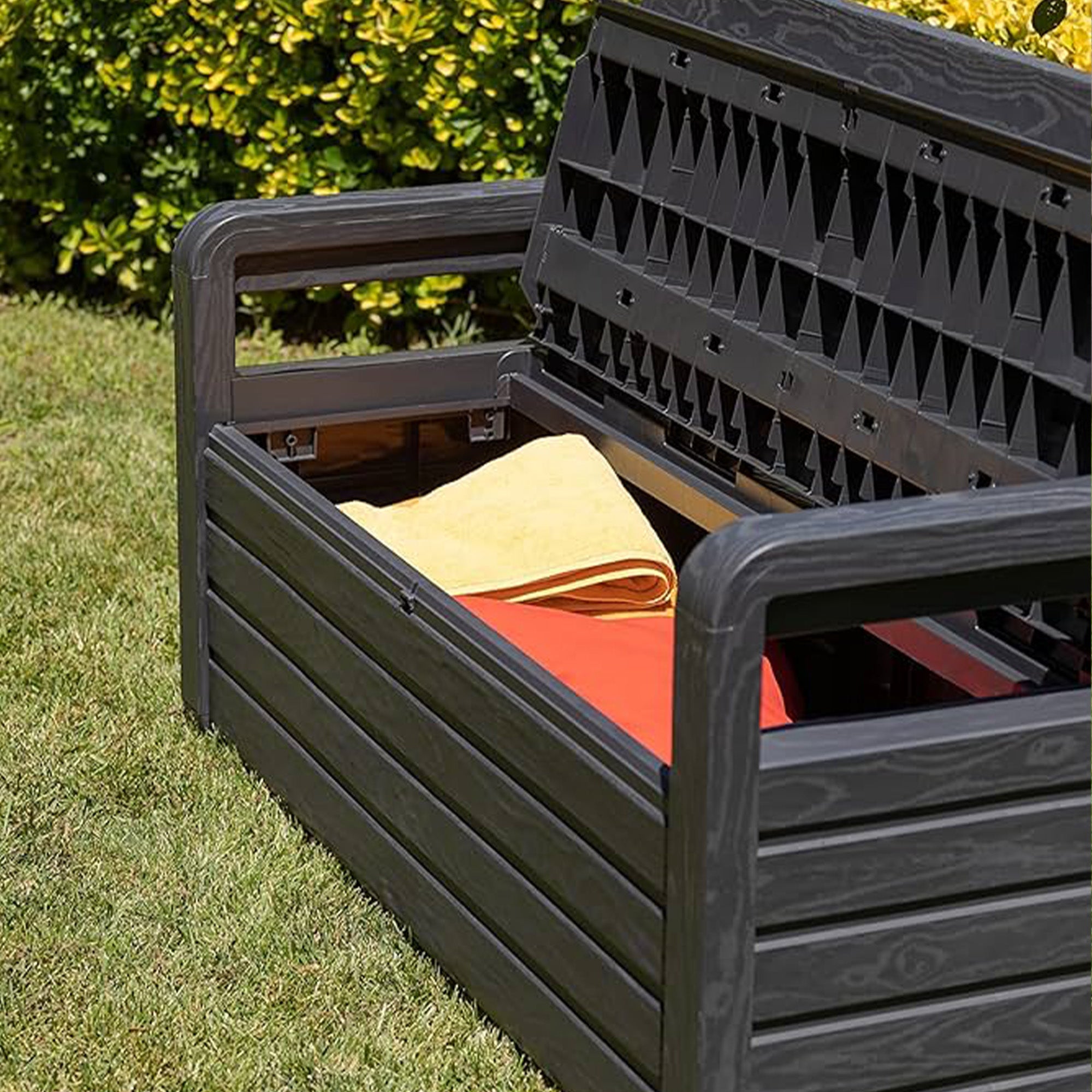 - Large storage bench is a great place to store outdoor patio furniture cushions, outdoor toys, pool accessories, and beach towels