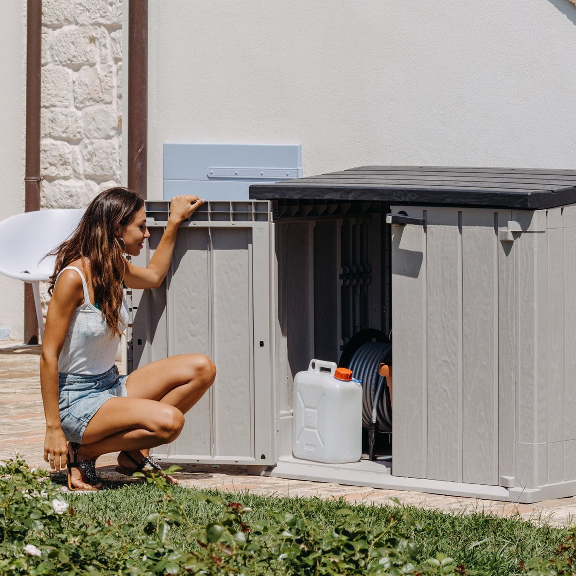 With a spacious inside giving you plenty of space for your outdoor furniture, stackable chairs, garden tools, or BBQ accessories. Alternatively, you can also store 2 trash cans and easily open the bin lid in a smooth motion with the hydraulic piston mechanism. This durable shed protects your garden tools or other equipment no matter the weather.