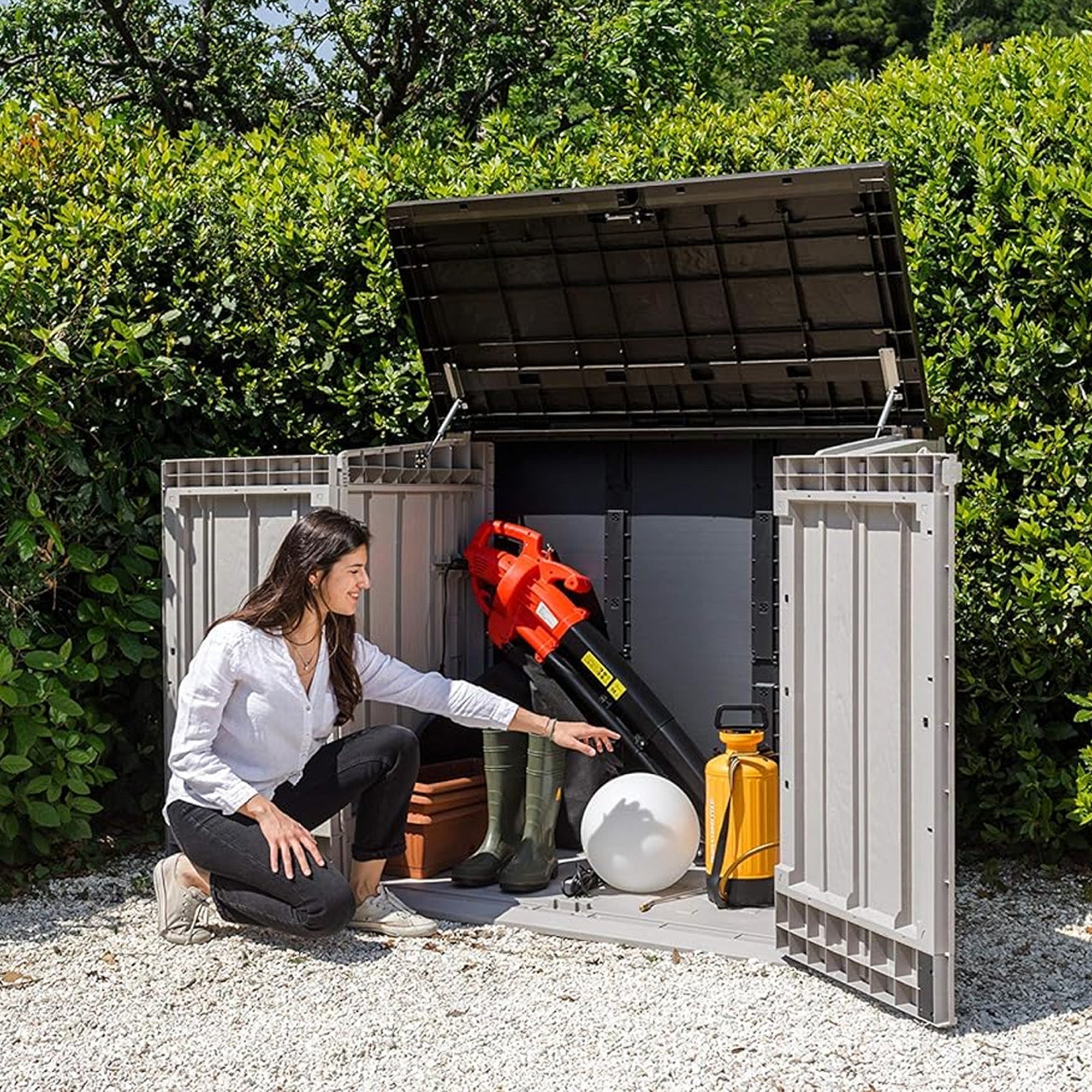 With a spacious inside, giving you plenty of space for your outdoor furniture, stackable chairs, garden tools, or BBQ accessories. Alternatively, you can also store 2 trash cans and easily open the bin lid in a smooth motion with the hydraulic piston mechanism. This weather-proof shed protects your garden tools or other equipment no matter the weather.