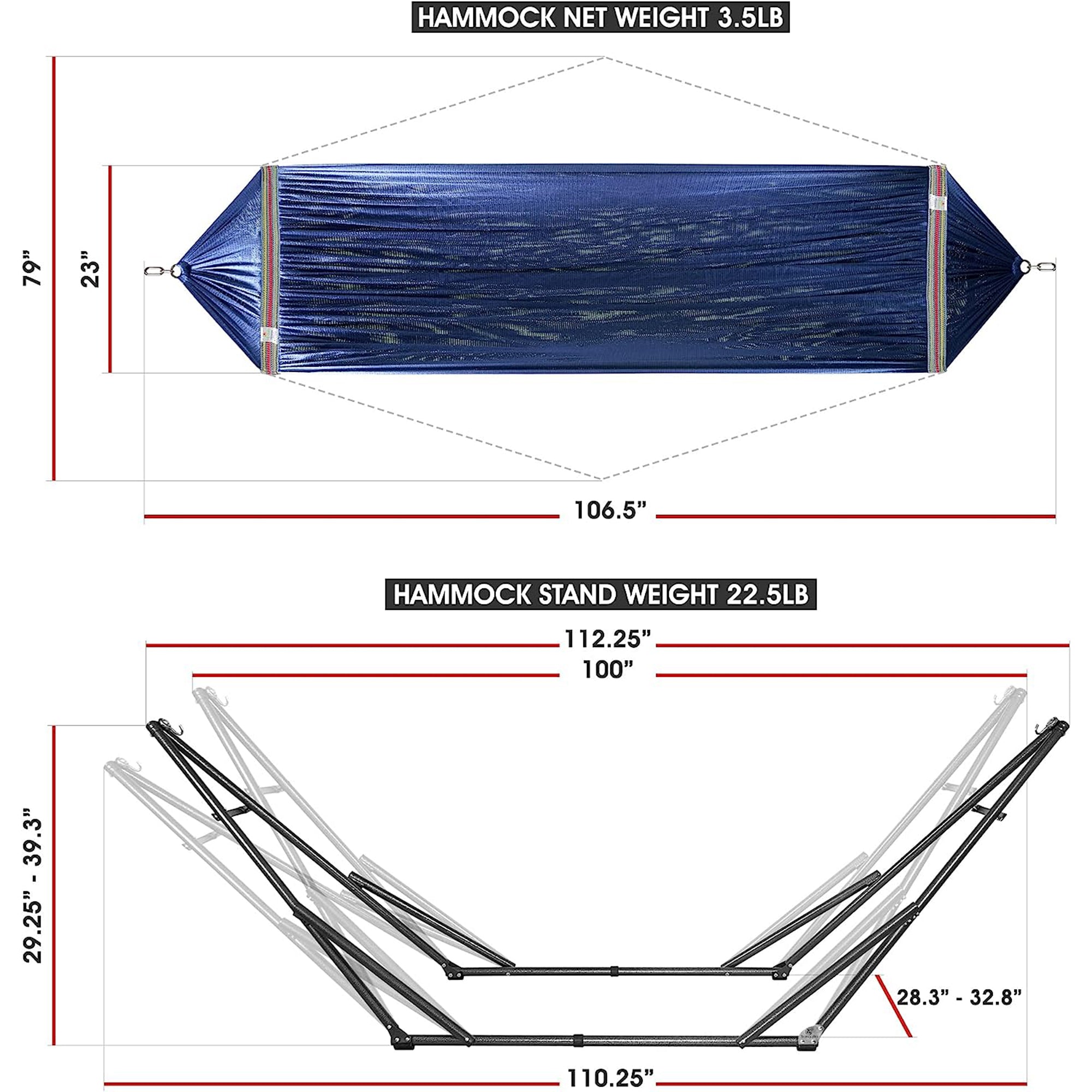 Equipped with 2 and 3 height adjustments and smooth ball bearings to ensure all rocking movements are flawless and noiseless, this hammock will satisfy all your relaxation needs. The powder-coated steel frame provides increased durability that supports up to 550 pounds. A carry bag is included to conveniently store and transport the hammock stand and net so you can quickly set it up on your next camping adventure or in your home when the time is right.