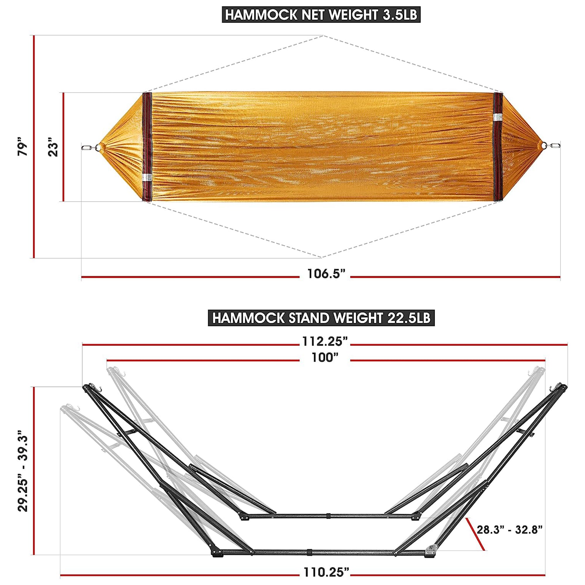 Equipped with 2 and 3 height adjustments and smooth ball bearings to ensure all rocking movements are flawless and noiseless, this hammock will satisfy all your relaxation needs. The powder-coated steel frame provides increased durability that supports up to 550 pounds. A carry bag is included to conveniently store and transport the hammock stand and net so you can quickly set it up on your next camping adventure or in your home when the time is right.