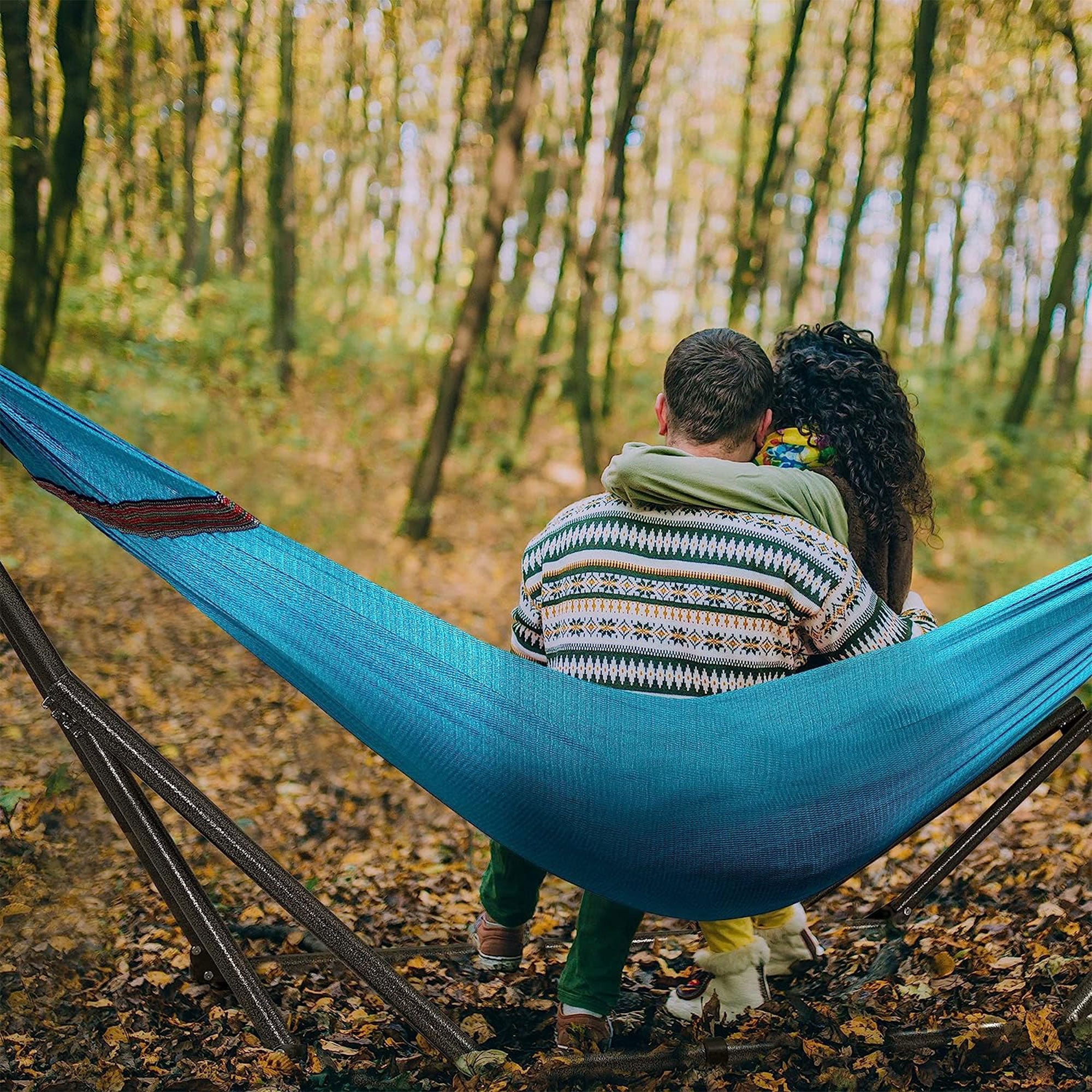 Equipped with 3 height adjustments and smooth ball bearings to ensure all rocking movements are flawless and noiseless, this hammock will satisfy all your relaxation needs. The powder-coated steel frame provides increased durability that supports up to 550 pounds. A carry bag is included to conveniently store and transport the hammock stand and net so you can quickly set it up on your next camping adventure or in your home when the time is right.
