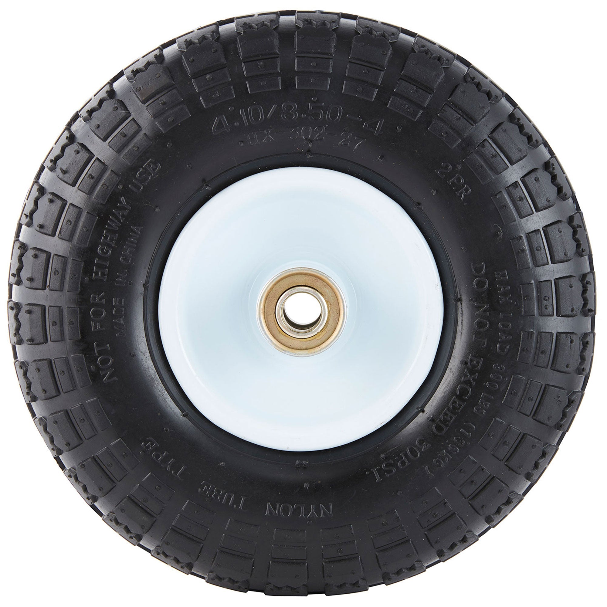 Switch out these heavy-duty pneumatic replacement turf utility cart tires on hand trucks, air compressors, garden and lawn carts, wagons, and more. Made of solid polyurethane, these long-lasting replacement tires have an offset wheel hub and boast a weight capacity of 300 pounds, giving you the flexibility to haul various materials. Each tire also features heavy-duty ball bearings and 5/8-inch bore size. The tire from top to bottom measures 10 inches with a 4-inch rim, 5/8 inch bore, and 3.5 inches of the tire all around the rim. These wheelbarrow tires are a perfect replacement for pneumatic tires and are compatible with many brands.
