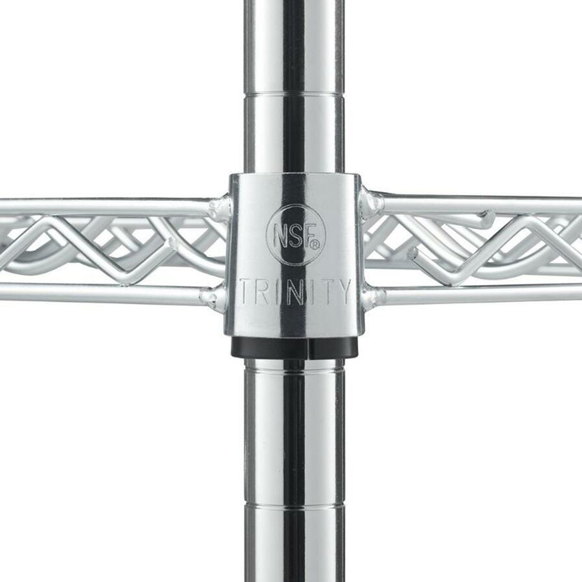 This wire rack holds 9 bottles per shelf to store a total of 36 of your favorite bottles. Whether you're storing this chrome shelf in your garage, office, or kitchen, the adjustable feet will keep the rack level for extra sturdiness. Each of the 4 shelves can be adjusted up or down in 1-inch increments using slip sleeves, allowing you to customize the rack to best fit your space. For added storage, attach a second TRINITY wine rack to the top shelf to double your wine storage without using more floor space. This chrome shelf comes with 4 poles, 34 slip sleeves, and 4 pole connectors to assemble right out of the box with no extra tools required for ease of use.