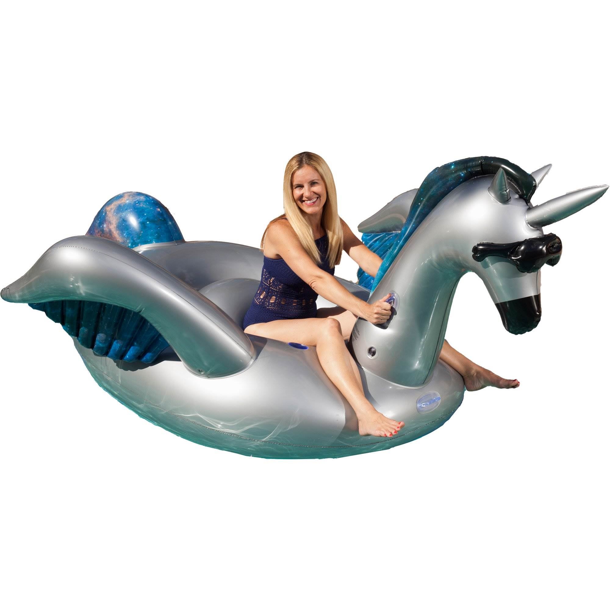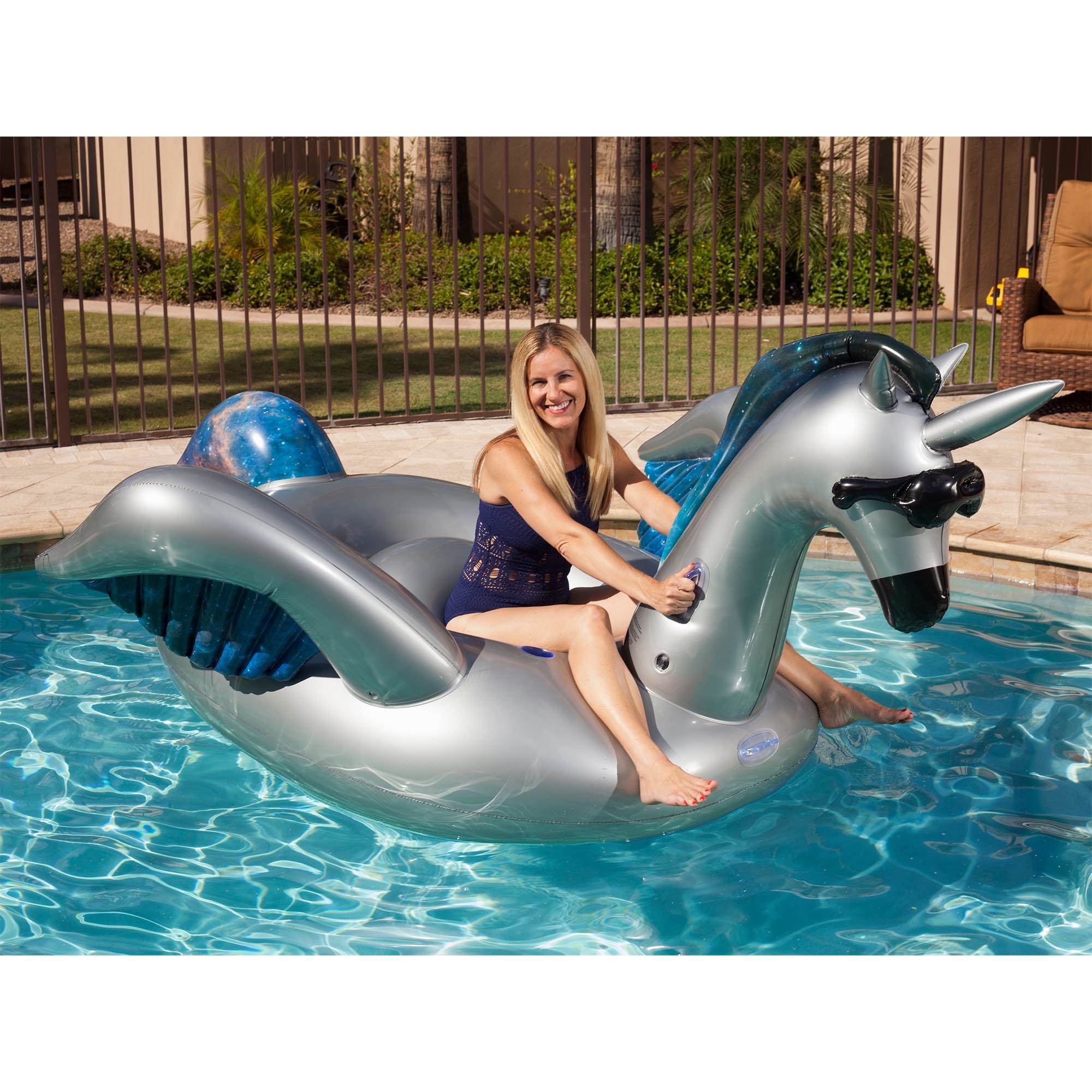 Hold on tight to the built-in handles as your imagination takes you on a ride. This winged unicorn makes everyone's dreams come true. Made of durable vinyl, it is ready to fly for hours and hours of fun. The alicorn's generous seating holds up to 2 people or up to 300 pounds and is designed for maximum comfort.