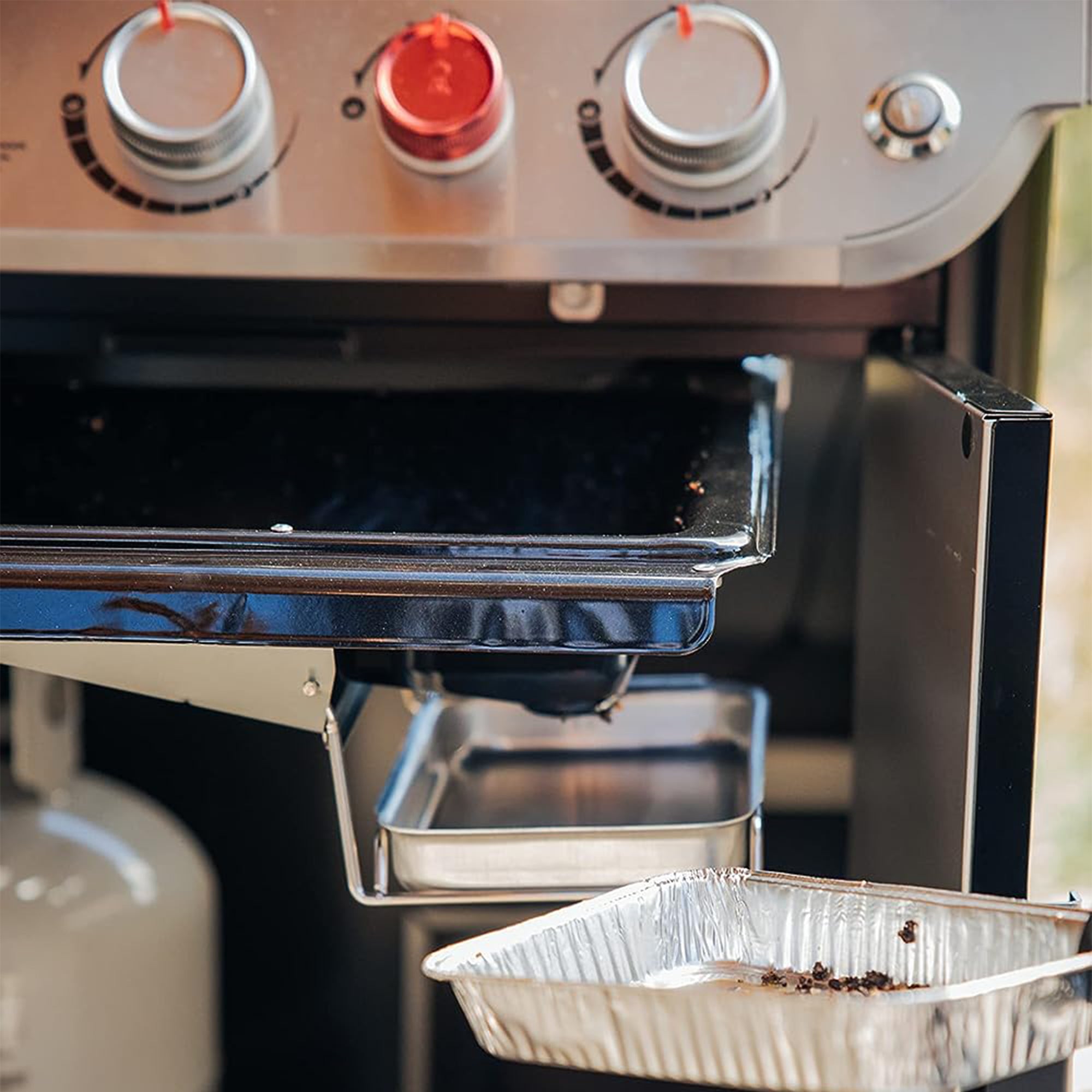 - Pull-out grease tray makes cleaning up after cooking a breeze