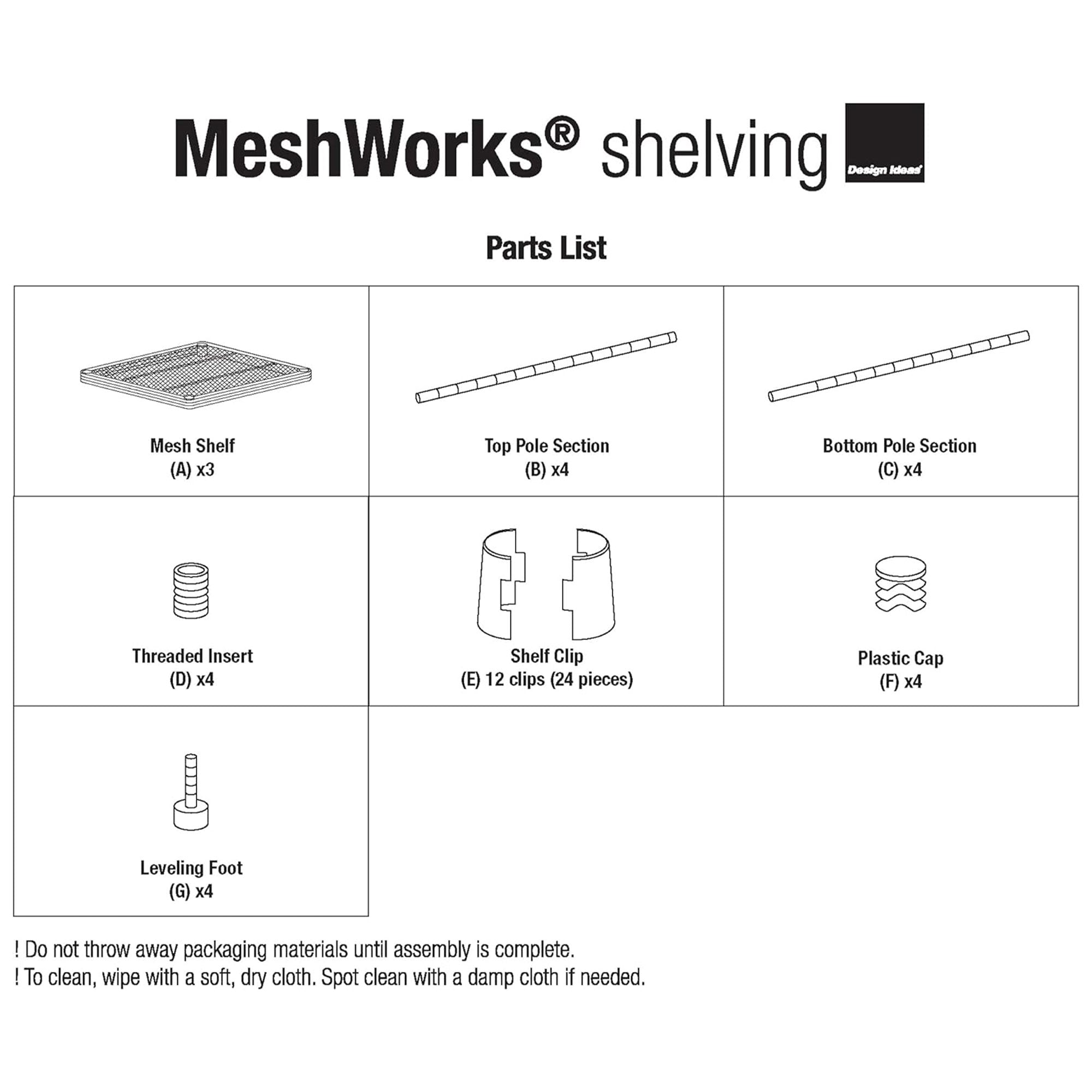• Easy to assemble with no tools required and comes with 3 shelves, 4 top pole sections, 4 bottom pole sections, 4 threaded inserts, 12 sets of shelf clips, 4 plastic caps, 4 leveling feet, and assembly instructions