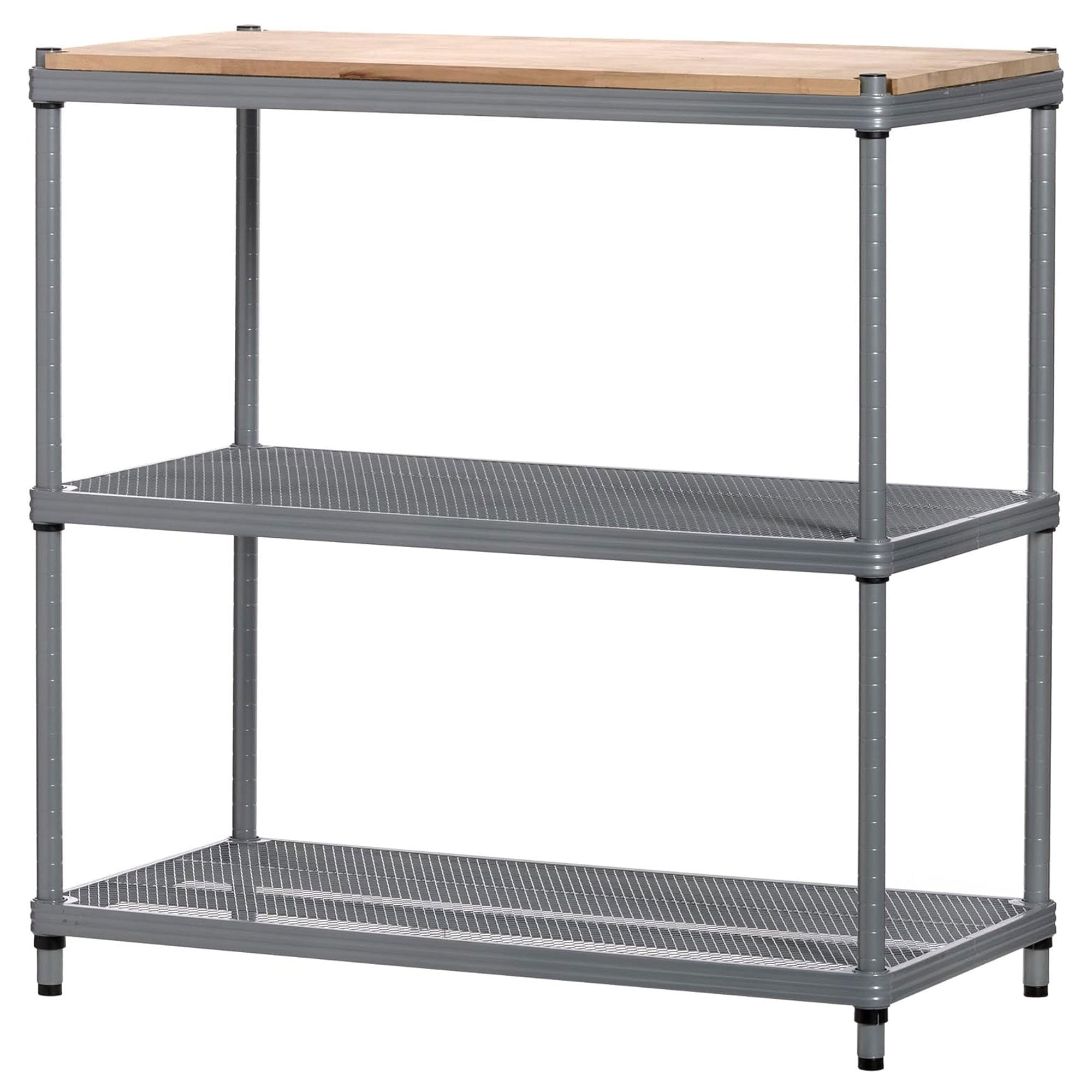 Get organized with the MeshWorks Metal Storage Wood Top Workbench Shelving Unit from Design Ideas. Built with your storage needs in mind, this garage accessory can be used in a wide variety of places. Put this storage essential in either your garage, kitchen, or office to organize tools, pantry items, gardening supplies, office accessories, and so much more!