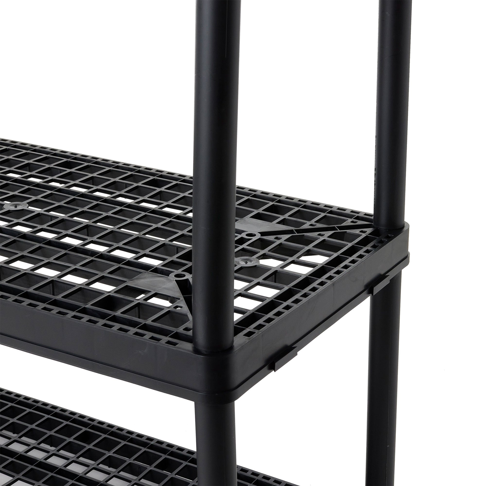 This bathroom storage shelf showcases timeless elegance for functional spaces with its lightweight, plastic construction and sleek color. Easily snap together for a simple installation process, and interconnect with additional units side-by-side for more storage space. Each ventilated shelf supports up to 150 pounds, providing a 600-pound unit capacity overall. Make sure that you distribute the weight evenly on the shelves for optimal, lasting use. With the 4 fixed shelves, you can organize laundry supplies, seasonal clothing items, home decor, toys, crafts, or tools. The closet storage shelf measures 18 inches long, 36 inches wide, and 54.5 inches tall offering a storage solution for any room. For added versatility, you can use the included brackets to mount the plastic shelves to the wall.