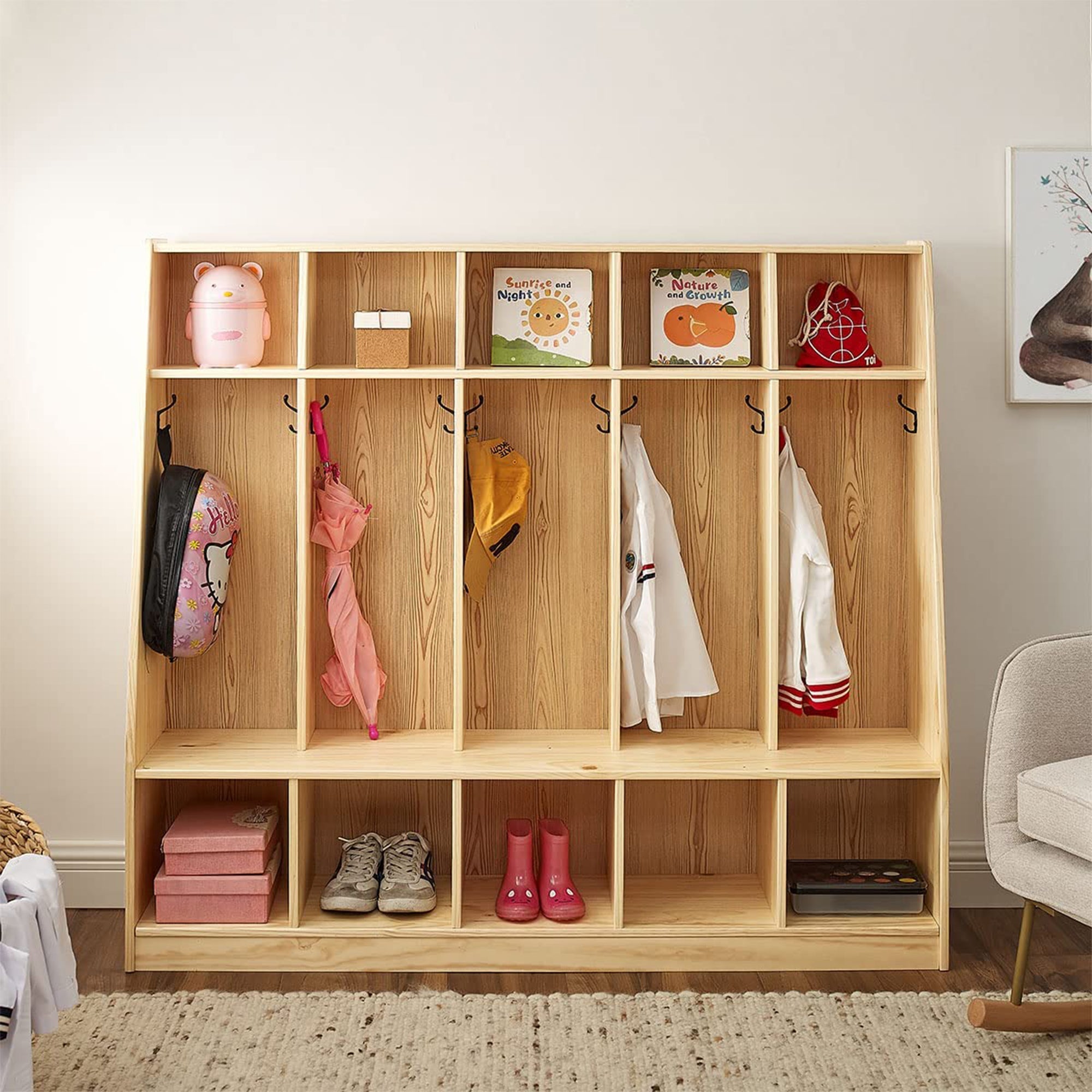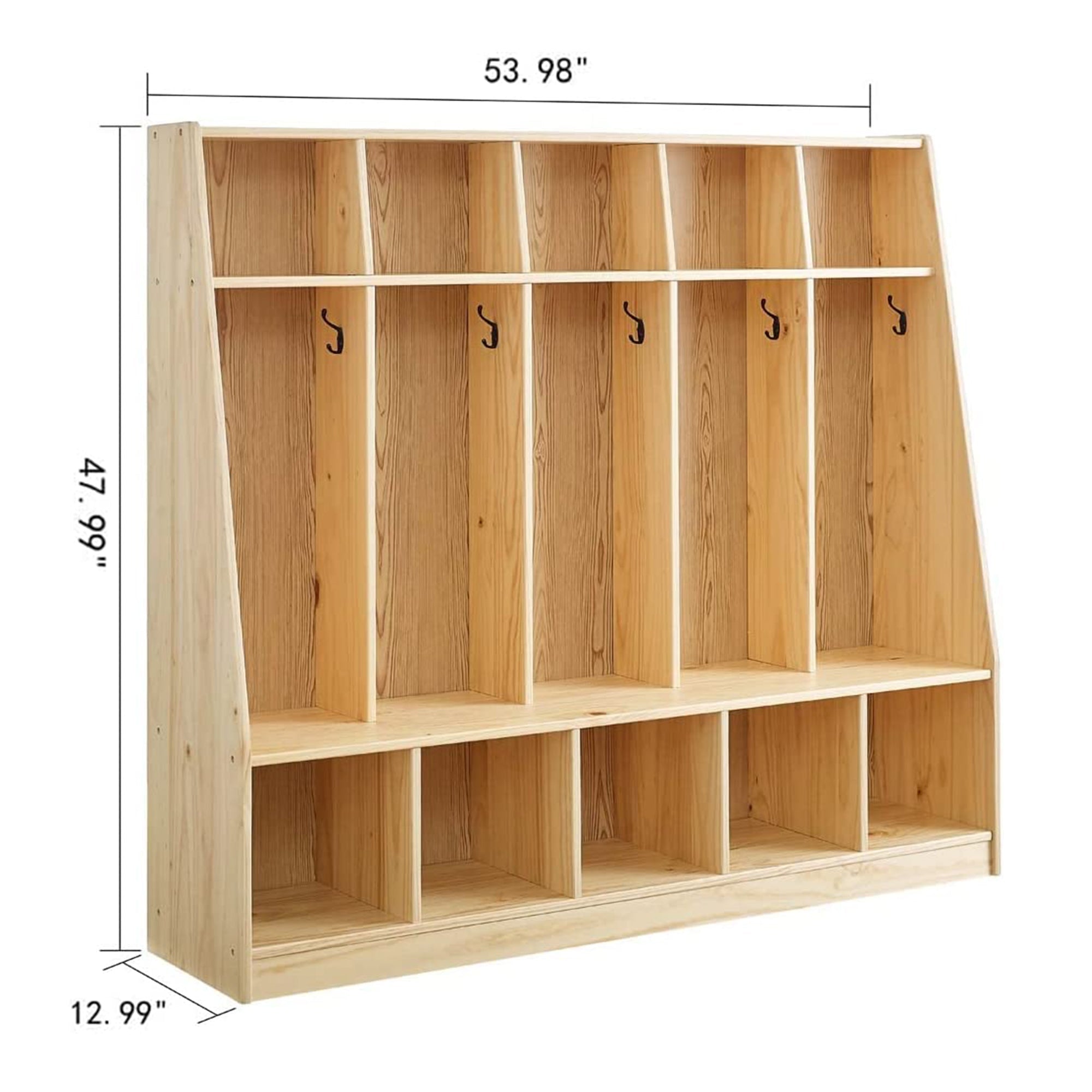 MUSHOMEINC 5-Section Classroom Coat Locker and Backpack Cubicle, Natural Pine