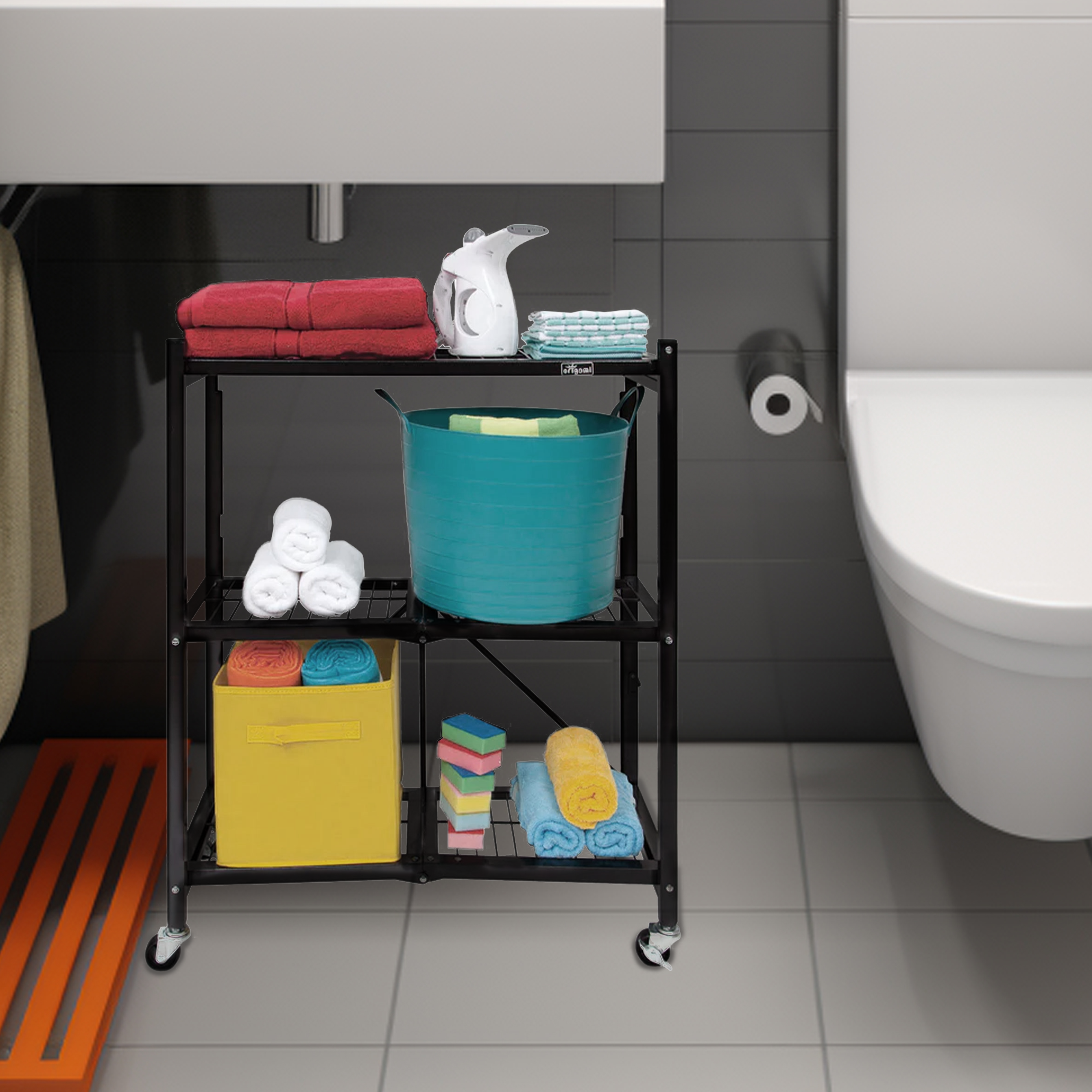 Best of all, this rolling cart requires no tools or lengthy assembly time. To set up, unfold the wire shelving frame, secure the patented Origami connection clip, flip the top shelf, and you're ready store bins and boxes. Then, simply fold the storage cart flat when not in use.