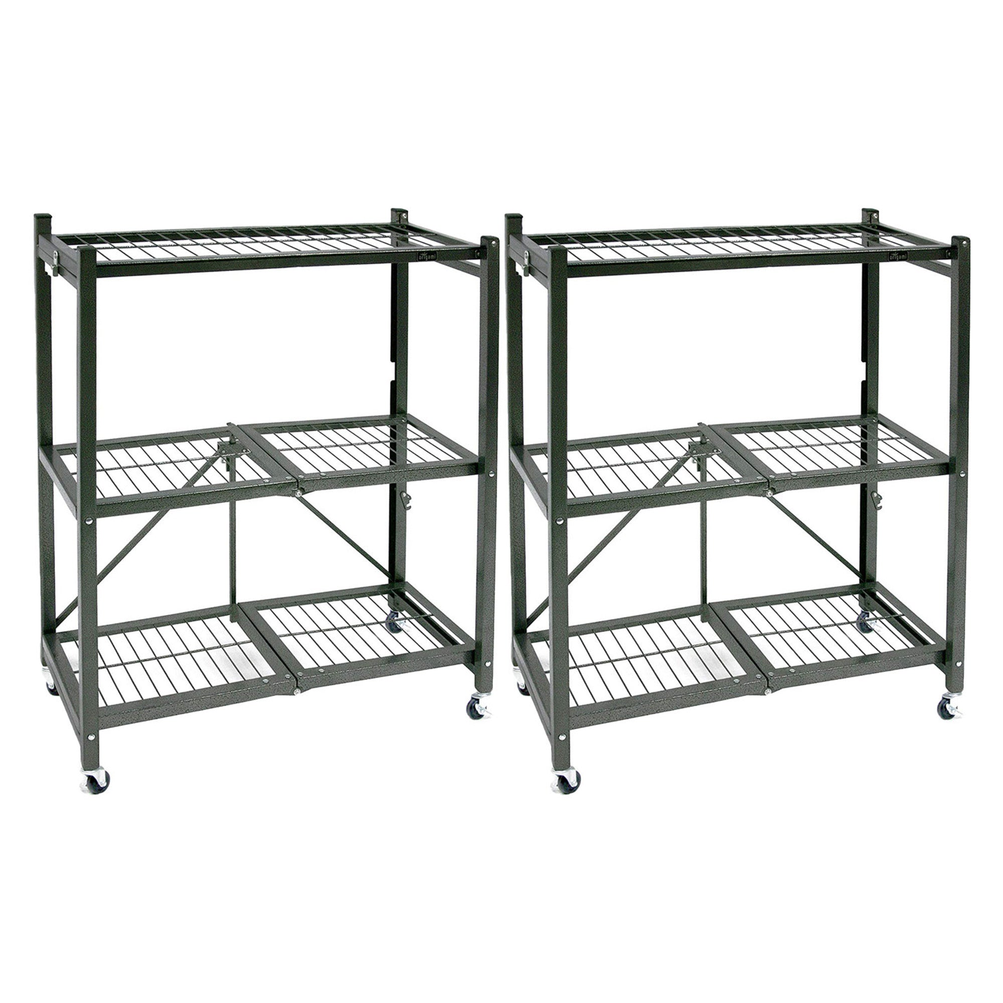 Origami R3 Foldable 3-Tiered Shelf Storage Rack & Wheels, Pewter (2 Pack)