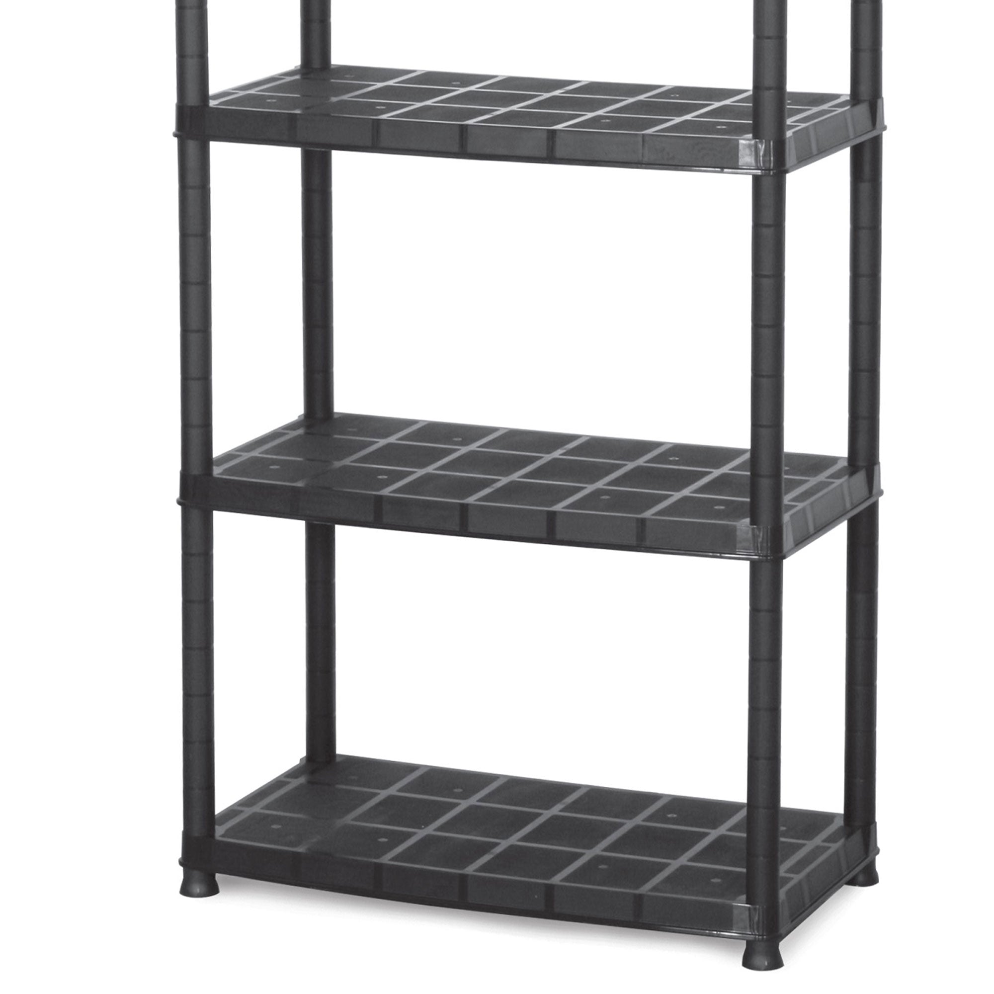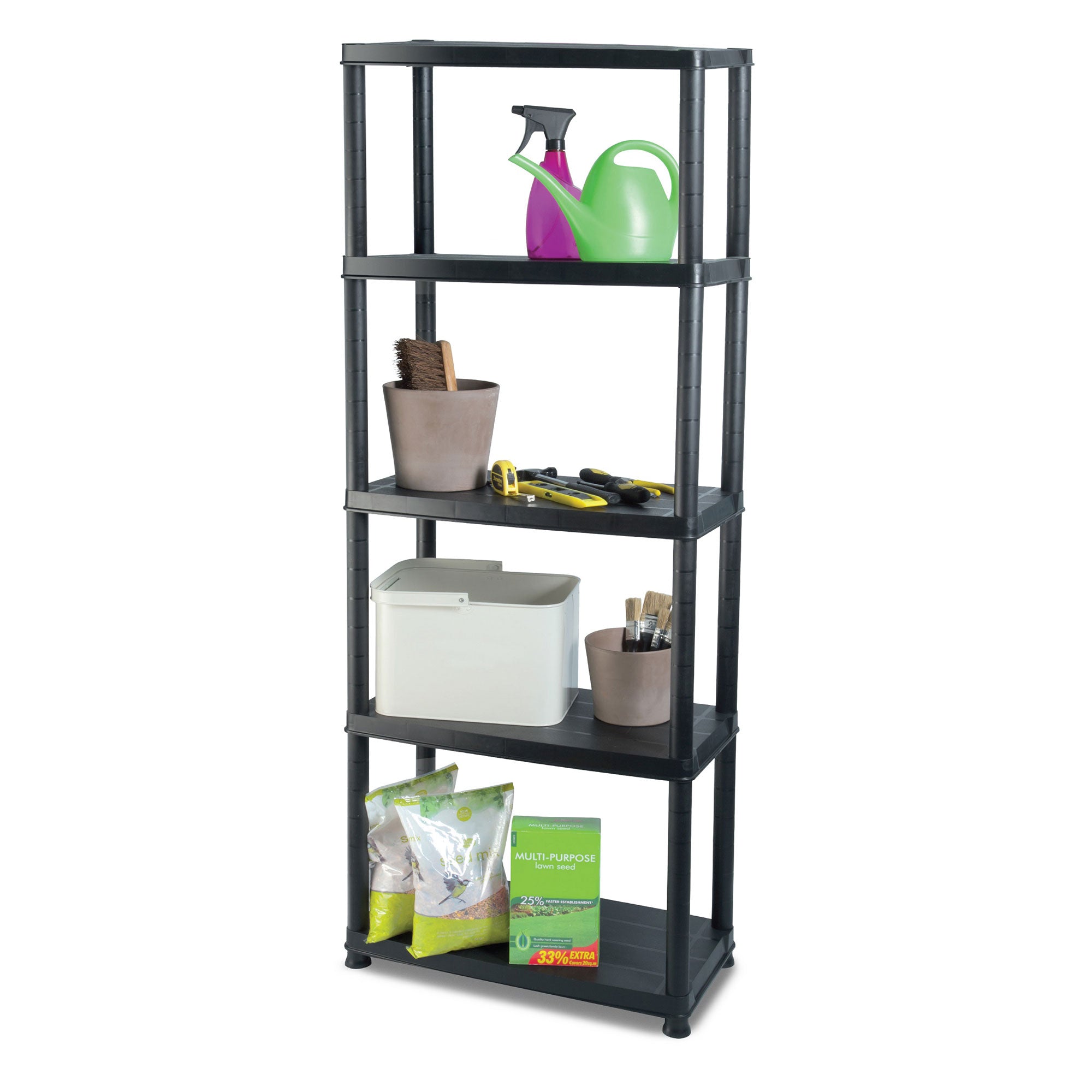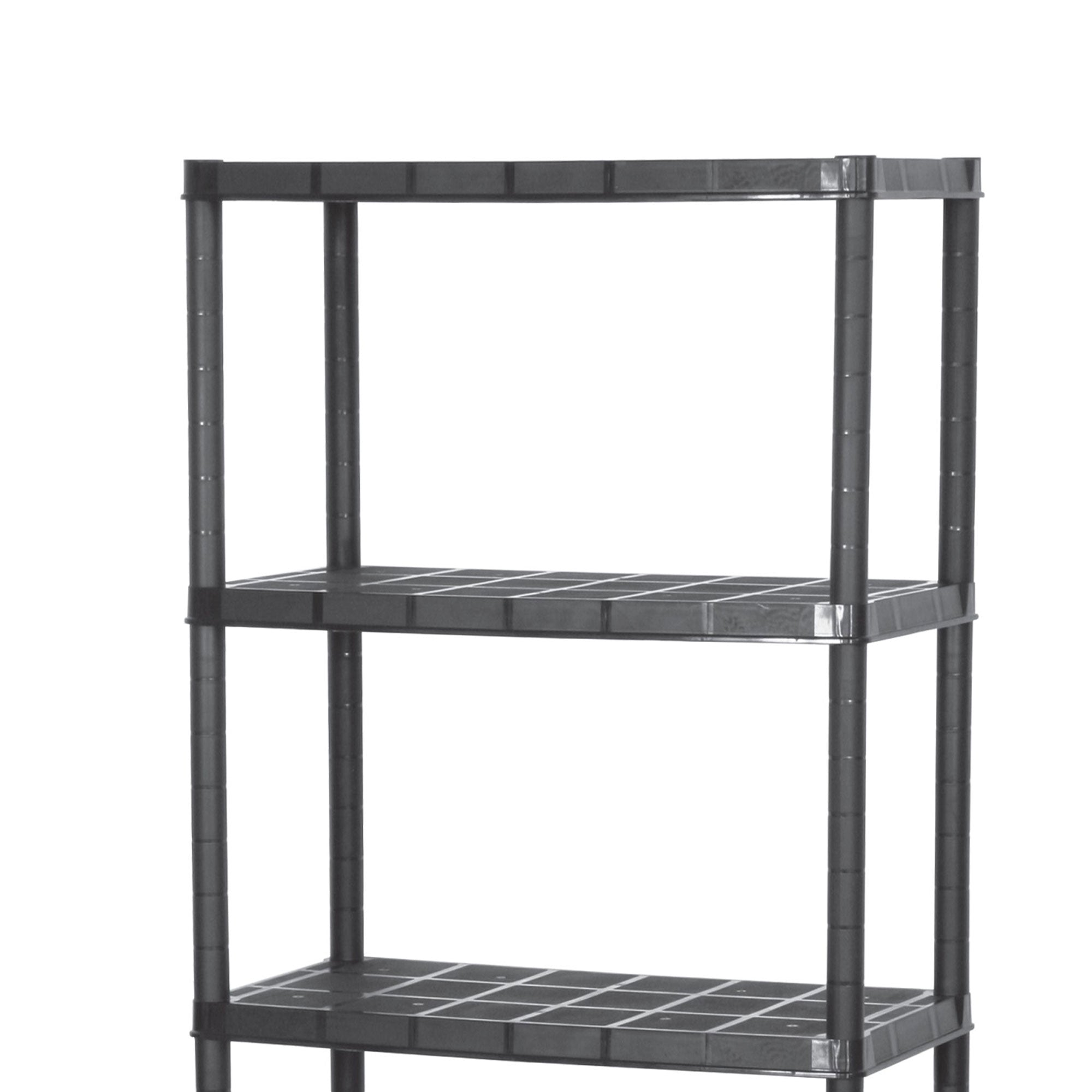This durable plastic shelving unit consists can be placed in any room to provide additional storage spaces and make the most of your living space. The tube and panel systems can be adjusted to different heights by reducing or adding tiers. The simple, yet stylish black design is sure to mesh well with any room you need extra storage space.
