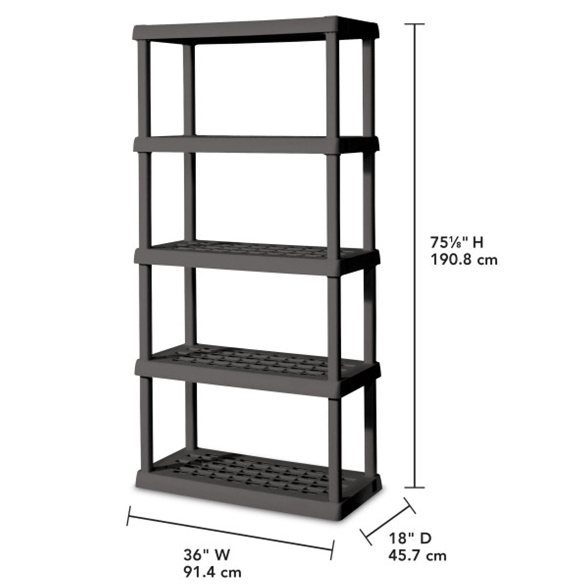 Each shelf has a recommended weight limit of 150 pounds. Shelving assembles easily in minutes without the use of tools, simplifying your organizational project. Create a custom storage solution with other Sterilite Hardware items, such as the 4-Shelf Cabinet, 4-Shelf Shelving Unit, and 4-Drawer Unit. Keep supplies, equipment, and other smaller items neatly contained in a variety of Sterilite Totes and Clear Storage Boxes, such as the 25 and 50-quart shelf totes. The overall assembled dimensions of these storage units measure 75.5 inches tall, 36 inches wide, and 18 inches deep for endless organization opportunities.