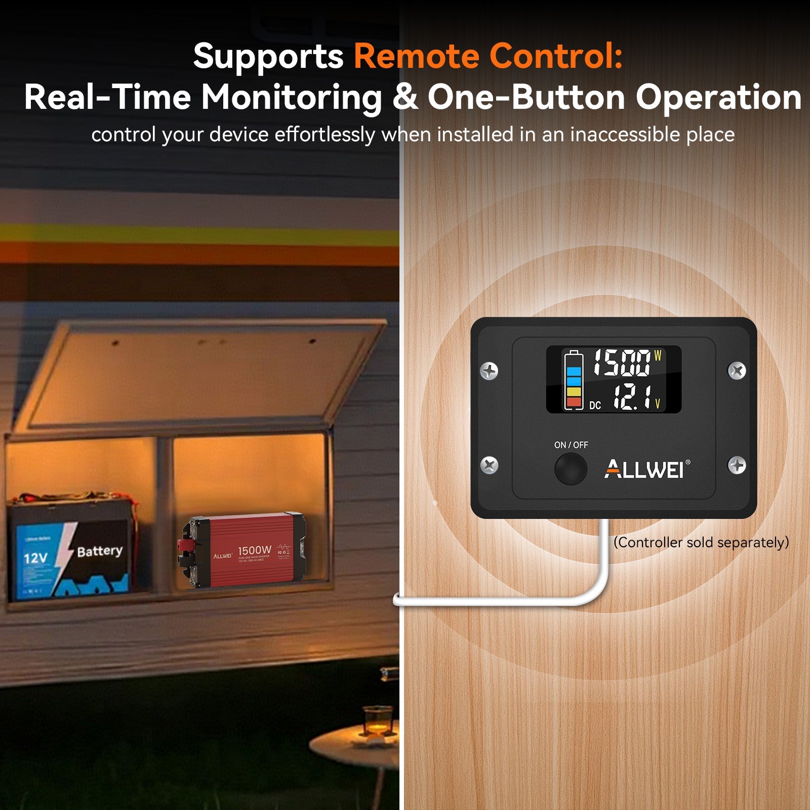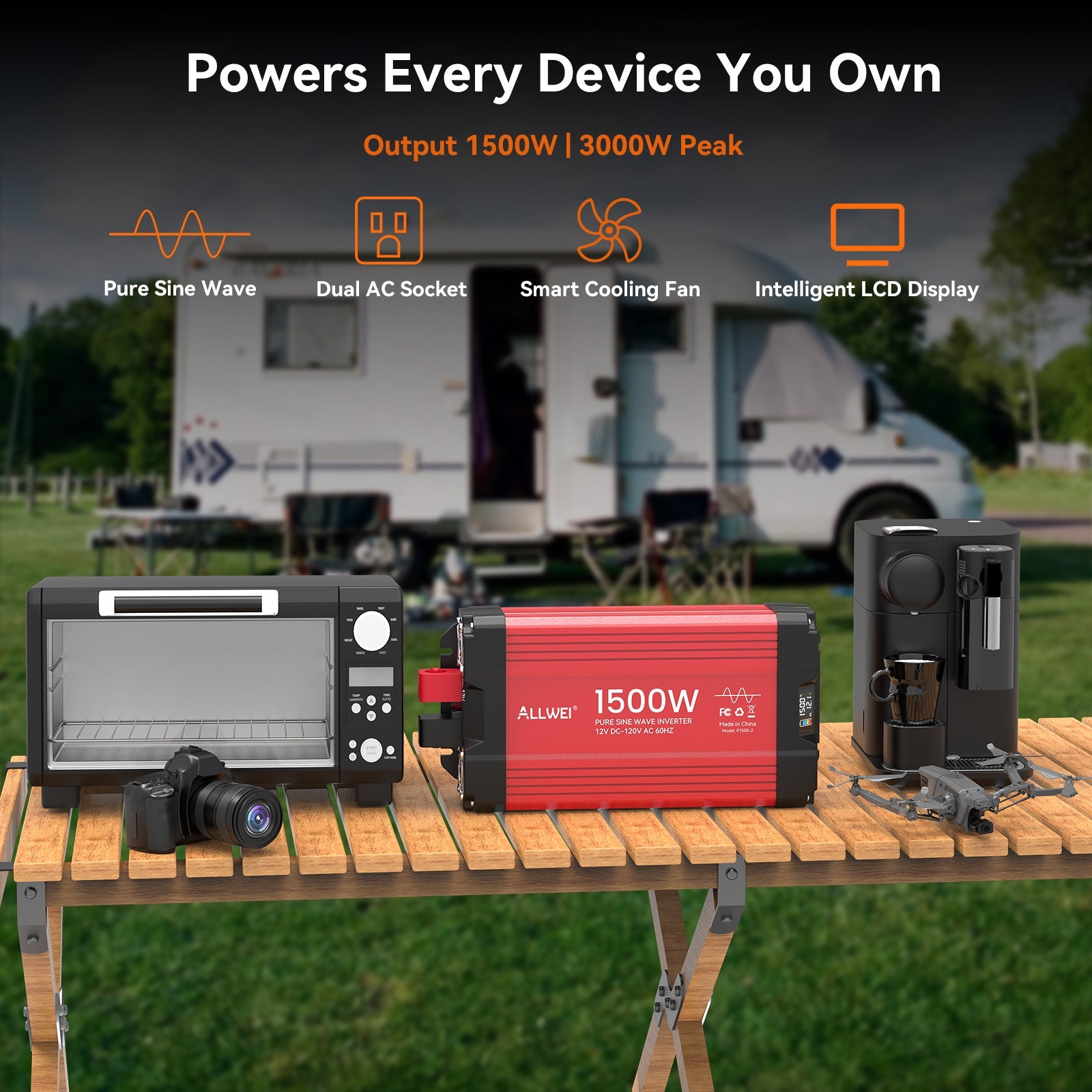 ALLWEI 12V to 110V pure sine wave inverter provides 1500W continuous power and 3000W peak surge with over 92% efficiency. The durable aluminum case withstands harsh conditions. Specs: 5.95 lb, operating range: 14°F–104°F.
