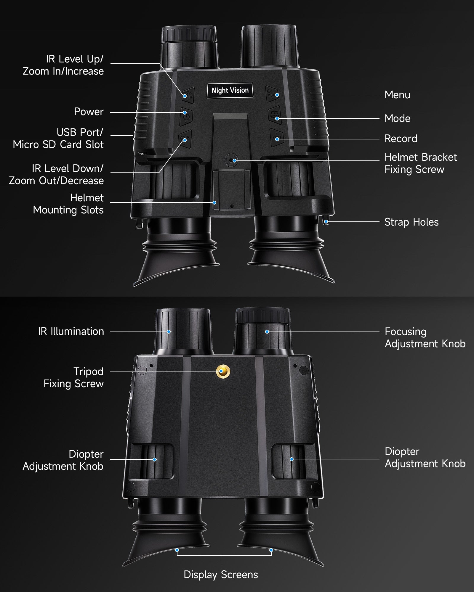 Elevate your nighttime adventures with Pinty's Tactical head-mounted binoculars, designed for durability with IP54 waterproofing and built to perform in any weather. Whether you're scanning distant landscapes with 7x magnification and dual 1.4 inch TFT screens or capturing the moment in crisp 1080P video and 3MP photo, every detail comes to life—even in the dark, thanks to this night vision goggles' 7-level infrared illumination. Adaptable to any situation, these night vision binoculars can be worn on your head, mounted on a helmet, or used handheld. Plus, with a long-lasting 3.7V 3000 mAh rechargeable battery and convenient Type-C charging, you're always ready for extended outdoor use.