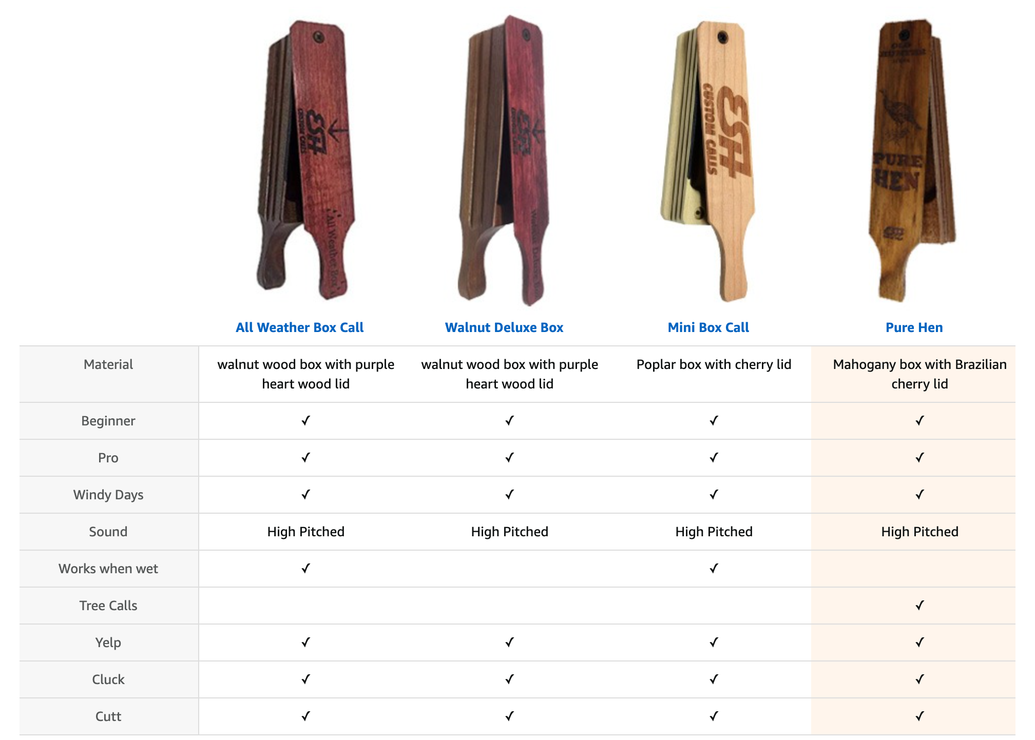 REALISTIC HEN SOUNDS - This box call for turkey hunting mimics the pure sound of a real hen even the wisest old tom will be fooled by. Our Pure Hen box call is a versatile hunting call which delivers realistic hen sound from soft tree yelps to clucks, purrs, fly down cackles, and excited cutting.