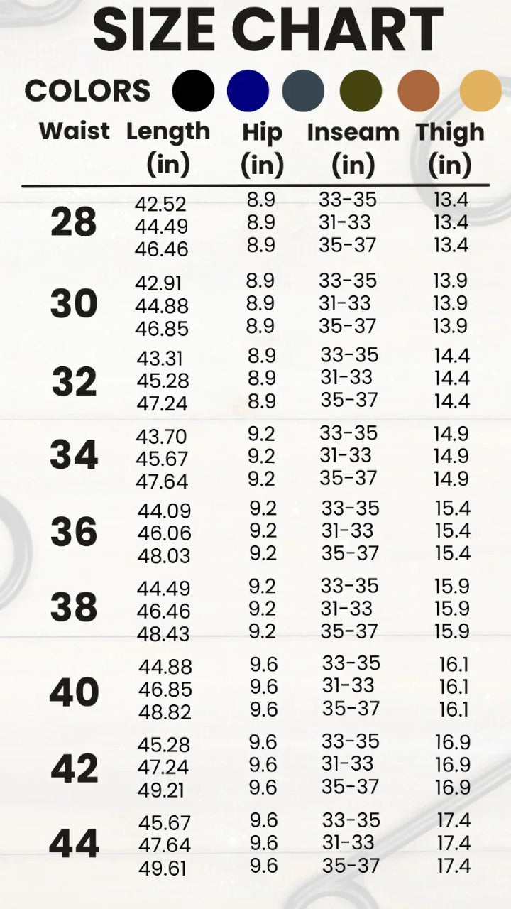 - Available in 27 different sizes and 6 different colors; Black, Navy Blue, Charcoal Grey, Olive, Khaki, Brown