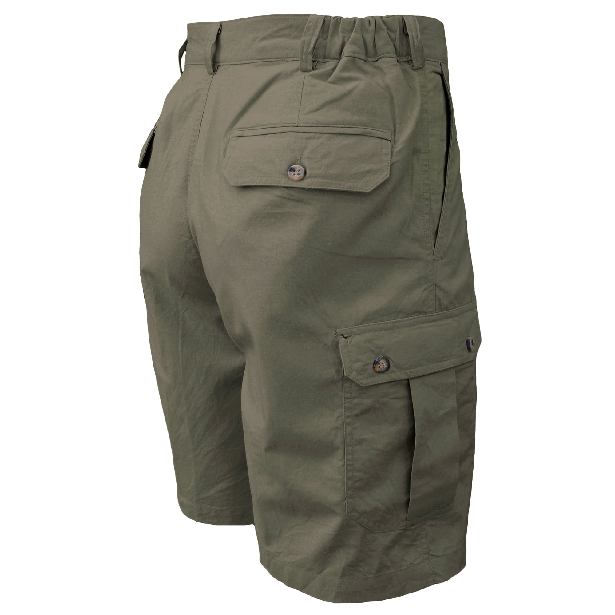 Our Cargo Shorts for men, with multiple pockets for storage and a full 9 inseam for leg protection, are the perfect fit for your African safari adventure. Two buttoned flap pockets on the side, two more in back, and two seam pockets on the hip provide plenty of room for much needed hunting and travel gear. Generous sizing, front pleats, and discreet elastic waist panels allow for flexible movement when tracking through the bush. Made in Africa from garment washed and pigment dyed 5 1/2 oz. cotton and double stitched for rugged dependability. These men's cargo shorts will meet the challenge, wherever you choose to go and whatever you choose to do.
