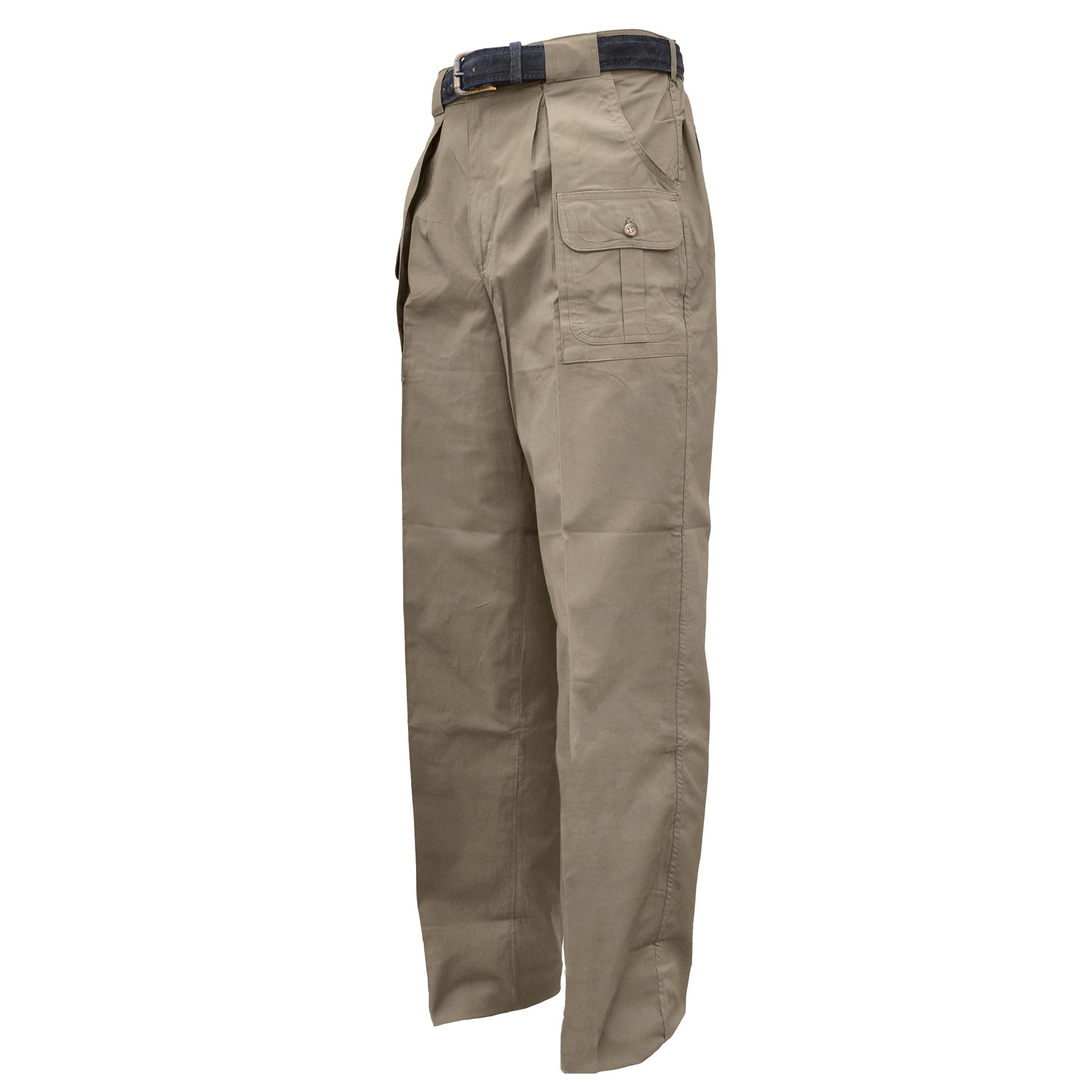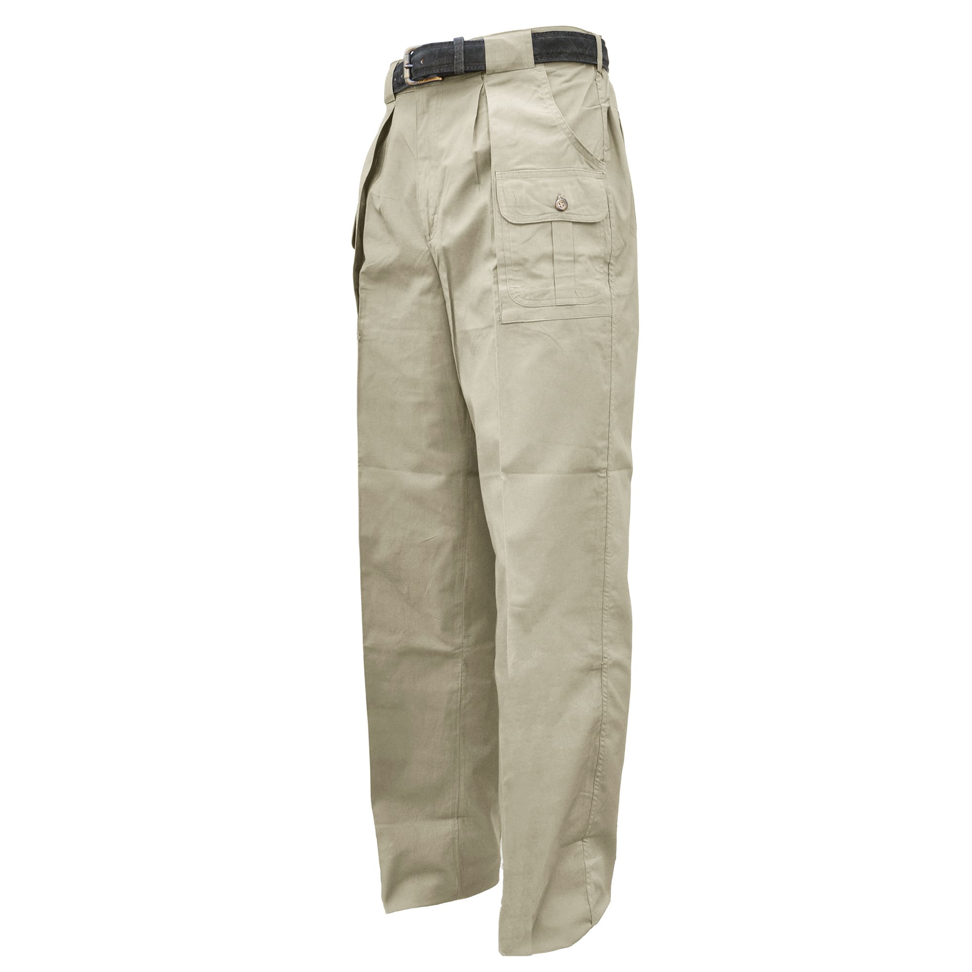 Six Pocket Congo Pants for men offer generous storage pockets and a roomy fit for your comfort when traveling to the African continent. Two buttoned flap covered pockets in the front, two in back, and two hip mounted side entry pockets, securely hold all your essential hunting gear. Expandable panels and generous sizing allow for flexibility and freedom of movement when tracking game or just exploring in the field. Large belt loops accommodate wide or heavy belts. Made in Africa from pre-washed and pigment dyed 100% cotton. These men's Congo pants with six pockets are the logical choice for the intrepid traveler and outdoor enthusiast.