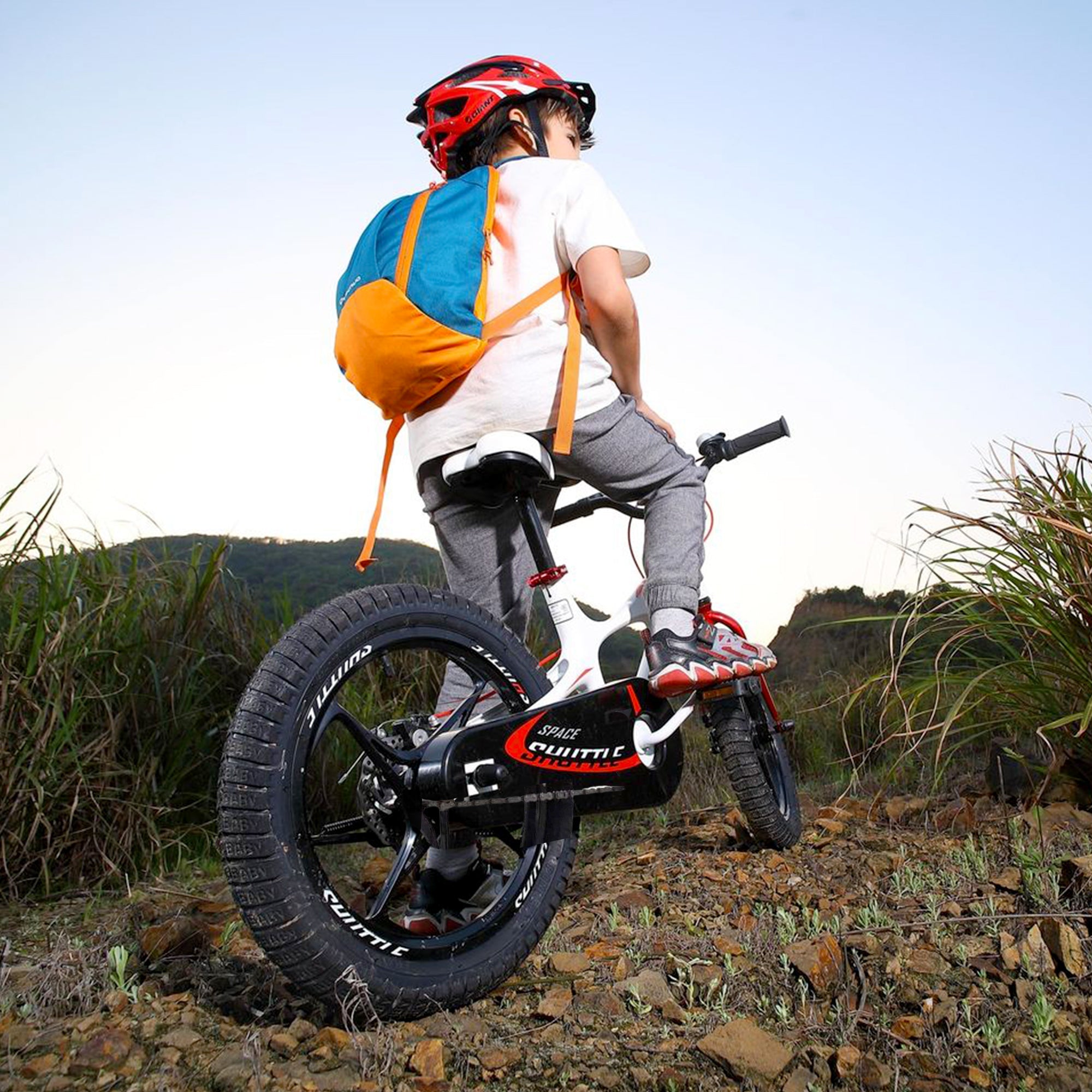 Crafted with care, the bike features safety grips, a plush seat, and a lightweight magnesium frame. The hollowed frame boasts alluring curves and sleek lines, exuding imaginative aerodynamics while you explore the great beyond. The enclosed chainguard, crank, and brakes protect against hazards, while the non-slip pedals offer stability. With 1.2mm-thick steel tubes and wide 2.4-inch tires, this bike is built to last.