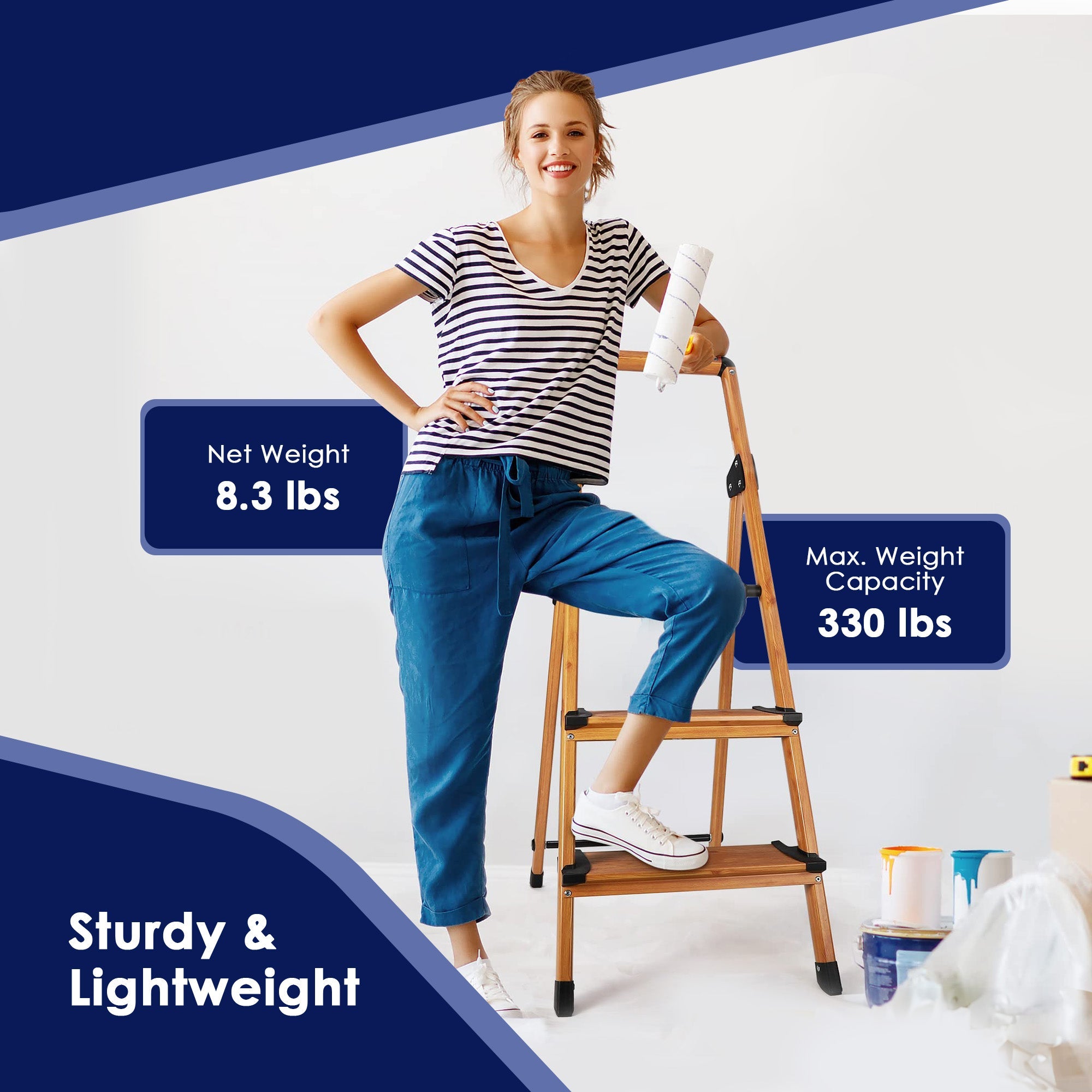 Crafted with sturdy aluminum, this stepladder can support up to 330 pounds, ensuring your safety and stability. The large resistant to slip platform and anti-skid rubber feet allow you to set both feet firmly in place while providing heel-to-toe foot support and avoiding floor scratches. With a snap-on safety latch, you can have full confidence when stepping on and off of this step-stool as the metal buckle locks automatically in place when the ladder is fully unfolded. Whether you're in the kitchen, bathroom, office, or garage, this woodgrain-style ladder is your versatile solution for home renovation projects, decorating your house, or just reaching where you need.