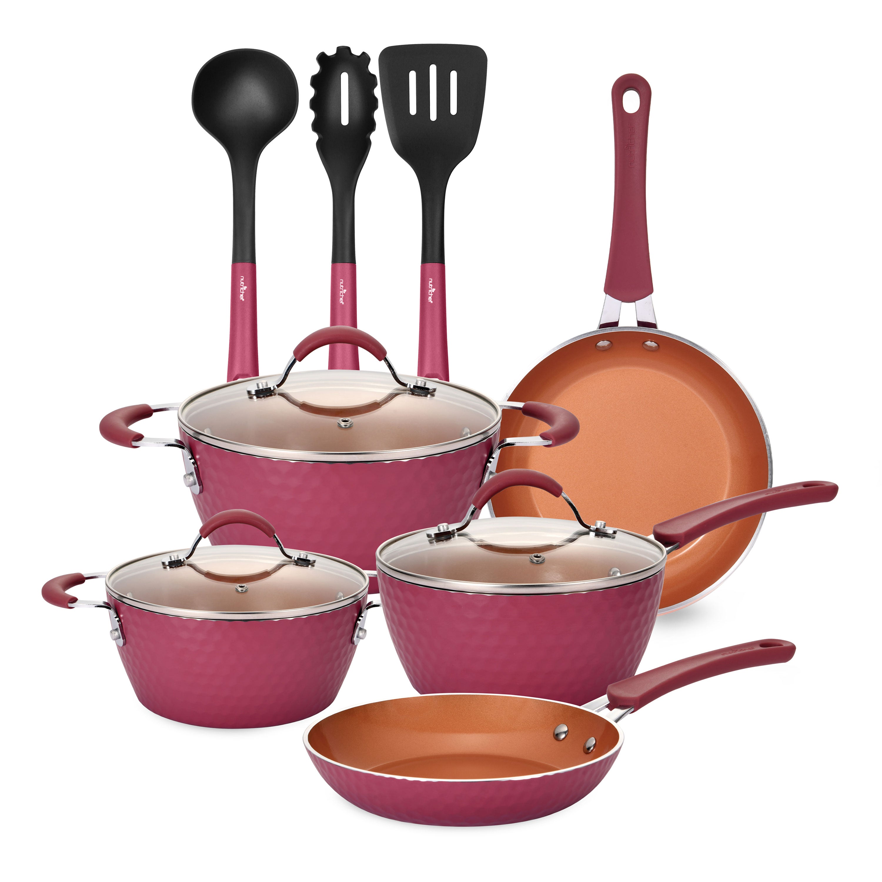 NutriChef 11 Piece Nonstick Elegant Diamond Pattern Kitchen Cookware Set, Pink