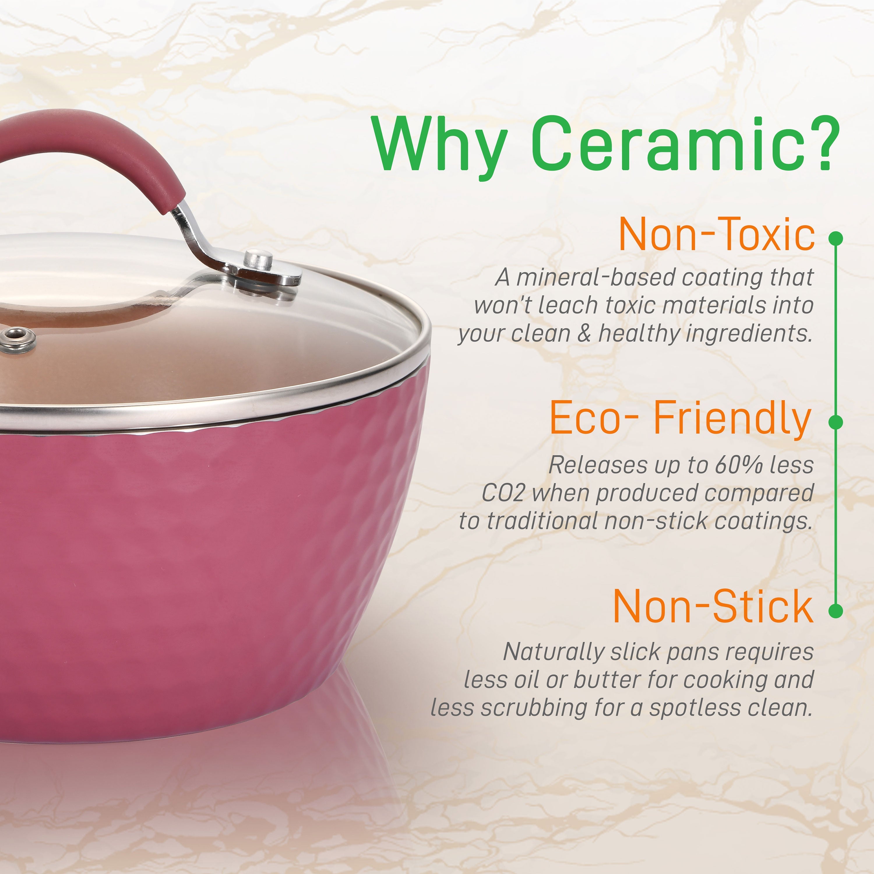 This 11-piece non-stick kitchenware set features a stylish modern cookware design and elegant diamond pattern to match any kitchen. The set includes a 1.7-quart saucepan pot with a lid, a 3.6-quart Dutch oven pot with a lid, a 2.1-quart cooking pot with a lid, an 11-inch large fry pan, an 8-inch small fry pan, soup ladle, pasta fork, and spatula.