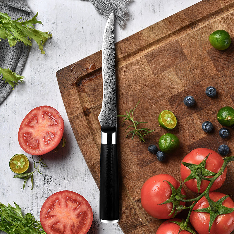 VG10 Damascus steel, renowned for its robustness, is a premium choice in knife making. It serves as the core in Damascus blades, typically layered with other stainless steels for enhanced aesthetics and performance. This steel is specially treated, oil quenched at 2100°F, and rapidly cooled twice to achieve a hardness of 58 or higher on the Rockwell scale. This process not only improves strength and edge retention but also creates the distinctive patterns that make Damascus knives highly prized by chefs and collectors alike.