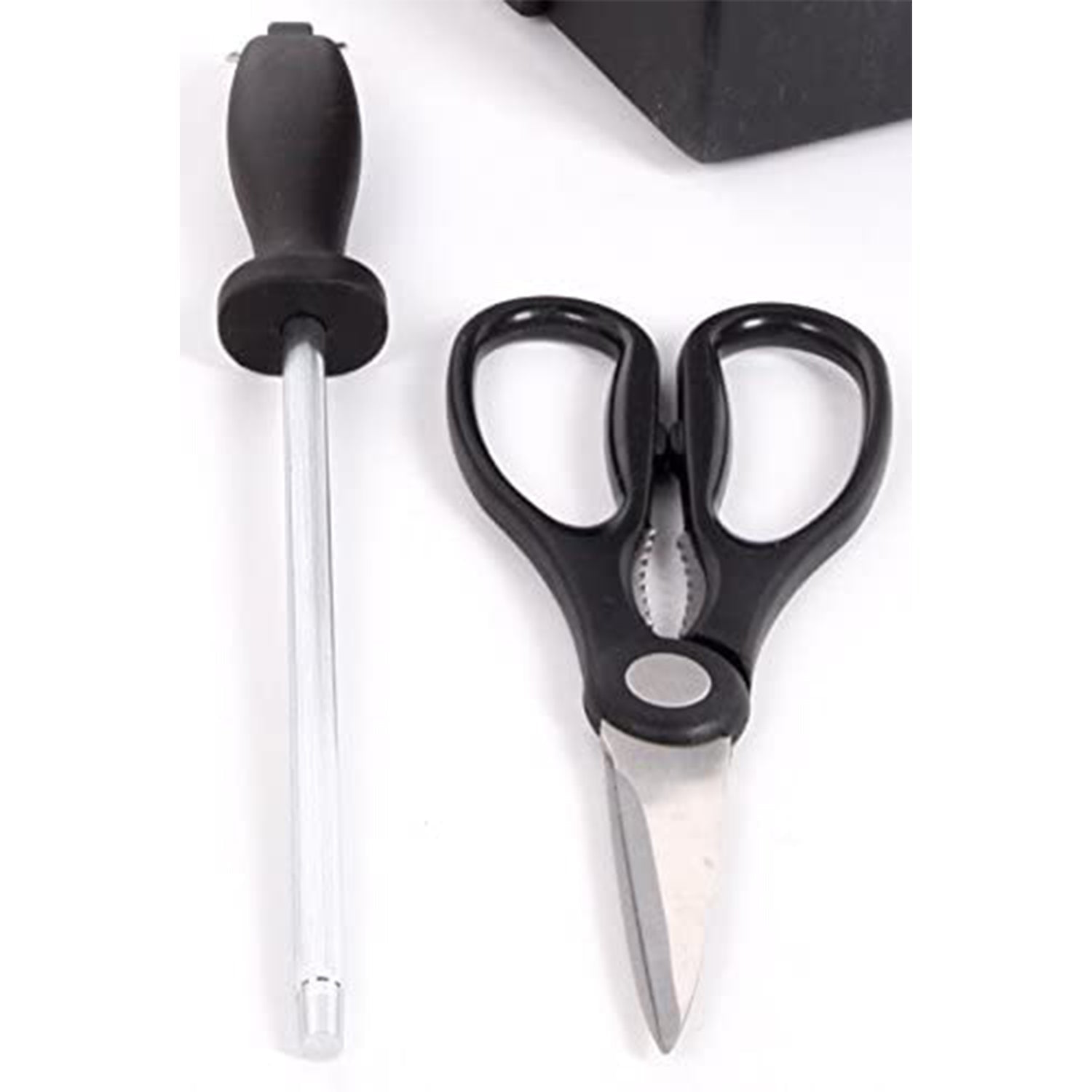 We know you take cooking seriously. Whether you're new to cooking or have been at it for years, this full cutlery set will become an essential piece in your home. With the included (6) 4.5-inch steak knives, (1) 6.5-inch santoku knife, (1) 8-inch carving knife, (1) 8-inch bread knife, (1) 5-inch utility knife, (1) 3.5-inch pairing knife, (1) kitchen scissors, (1) sharpening steel, and (1) 360-degree swivel block, you can conveniently make all your favorite meals.