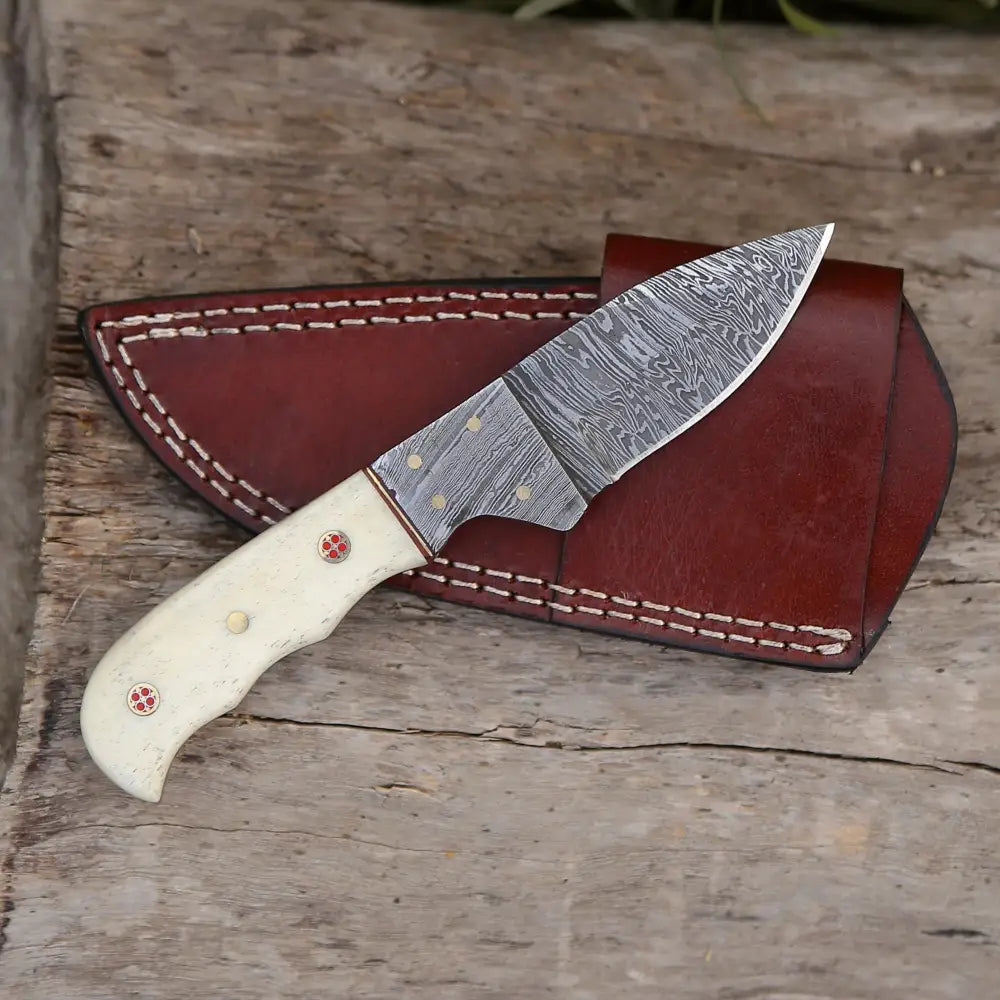 7.25” Hand Forged Damascus Steel Full Tang Skinner Knife - Camel Bone Handle