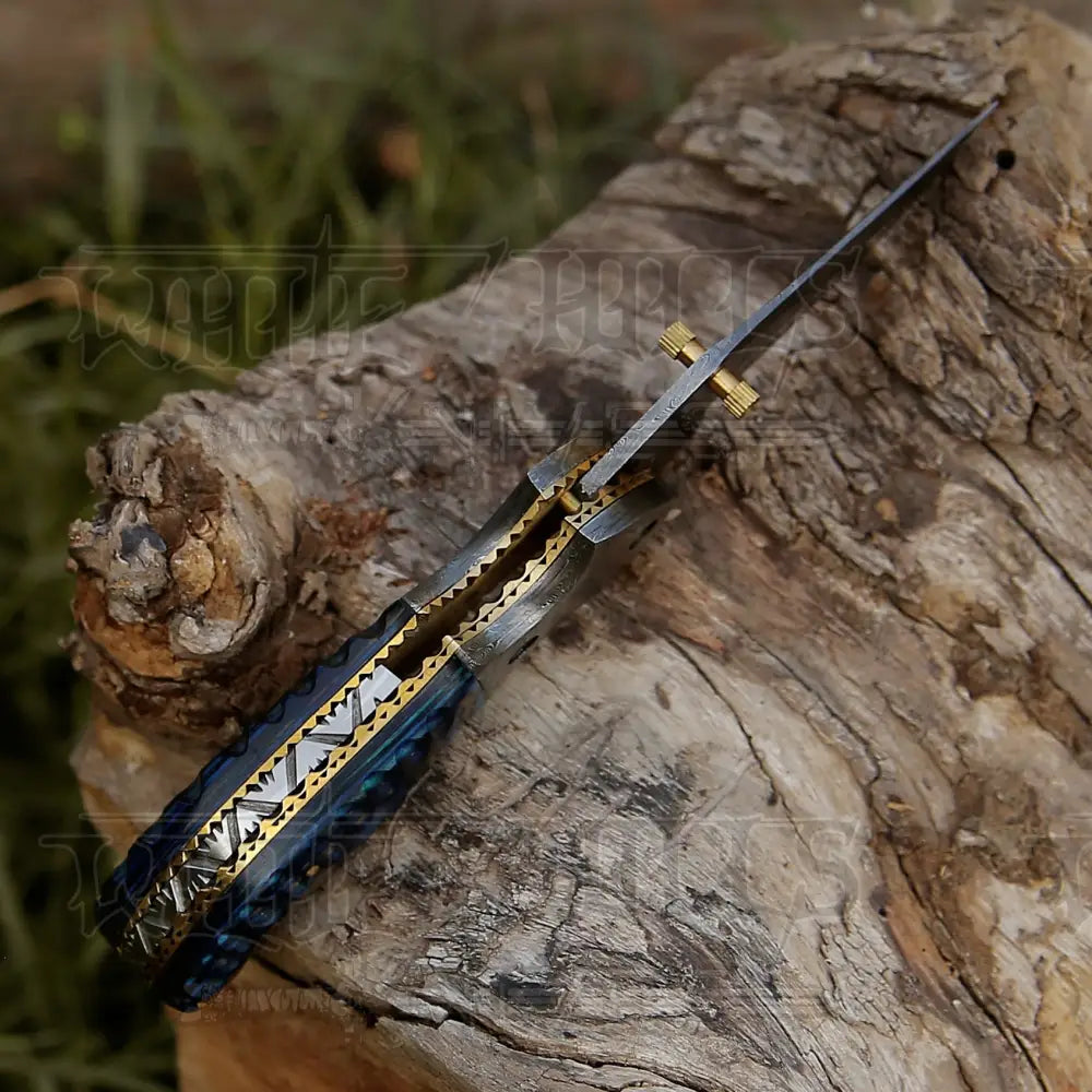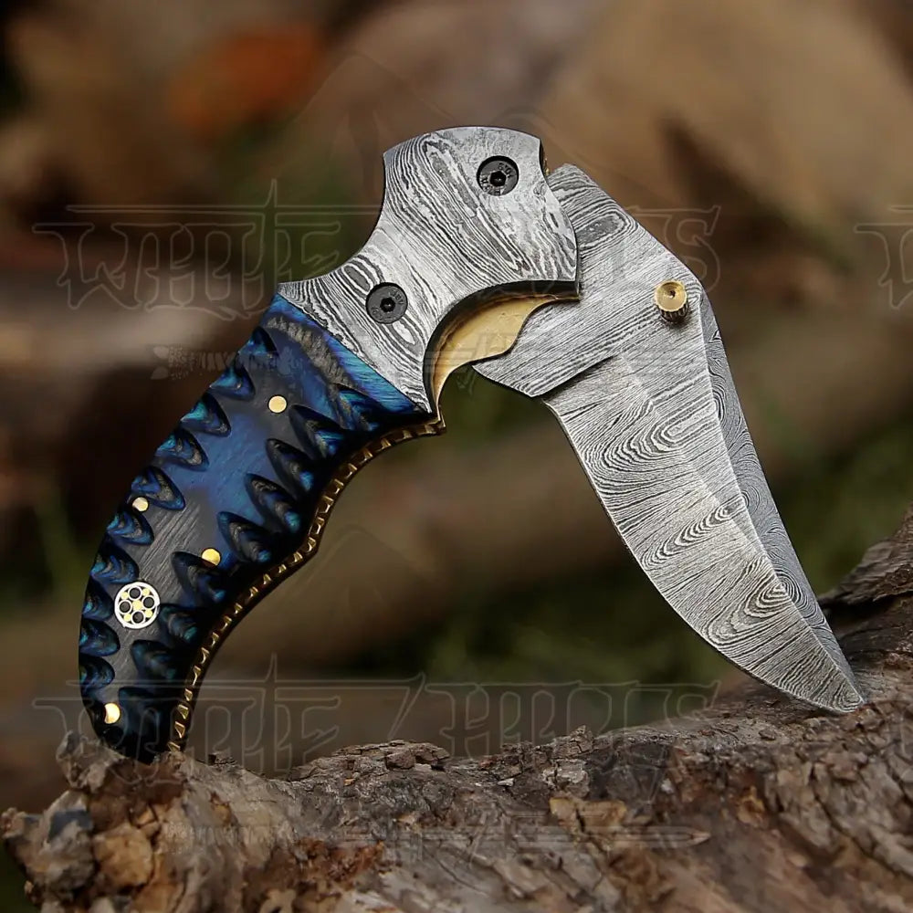 7" Handmade Forged Damascus Pocket Folding Knife - Blue Pakka Wood Handle - Damascus Bolster WH 3531