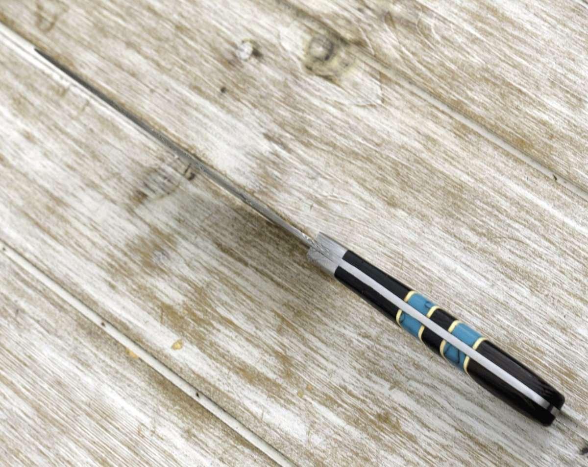 Damascus Chef Knife. Featuring a drop-point French blade design and an exotic handle made of wenge wood and turquoise, this knife is more than just a tool—it's an experience.