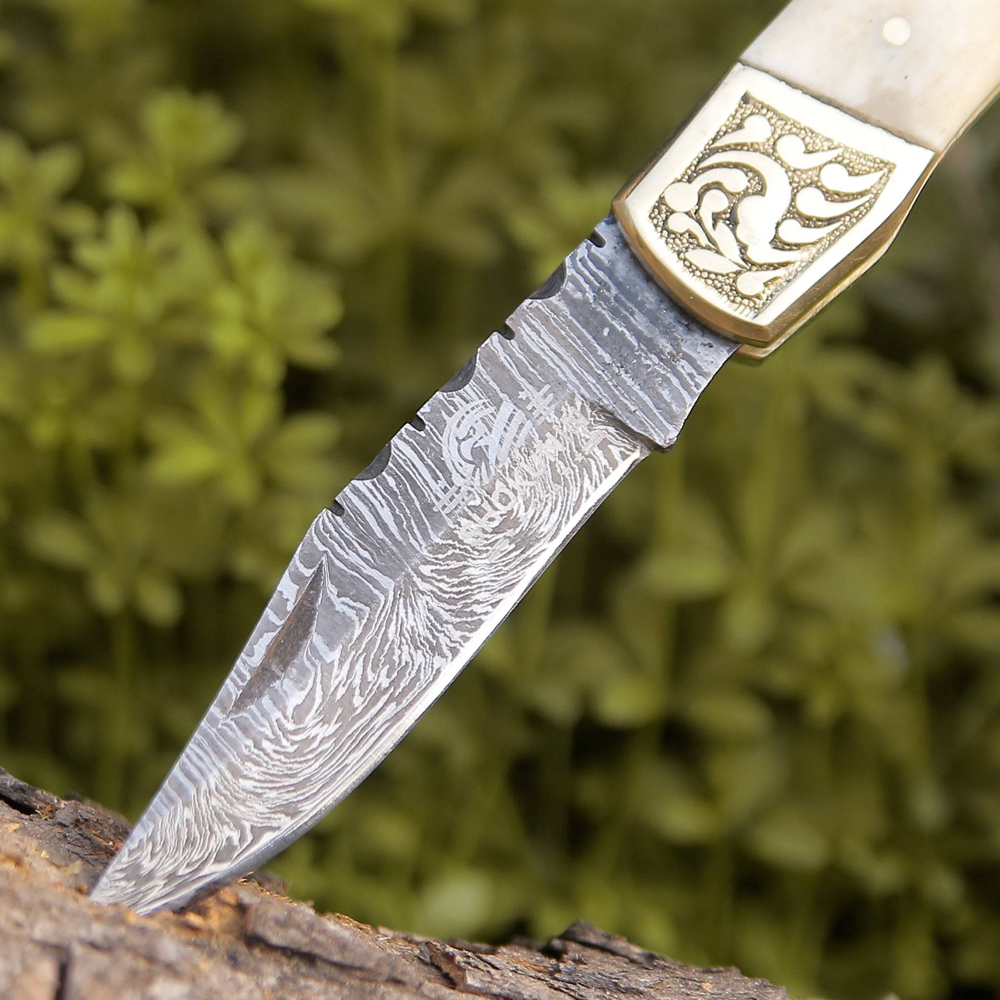 Expedition Handmade Custom Damascus Blade Pocket Knife With Bone Handle - 7.5" Overall with Carved Brass & Bone Scales, Back lock Pocket knife with Hand Stitched Leather Sheath, Pro Knife Sharpening, Spare Pocket knife Sharpener & Personalized