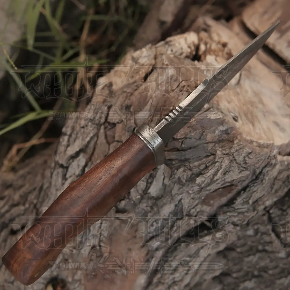 This superb design knife is hand forged.Blade of this knife has a nice file work and is made of 512 layers of stainless steel and high carbon steel with hardness 55-60 HRC. This robust knife is lab tested under intense conditions,; the balance and shape of this knife ensures perfect grip.