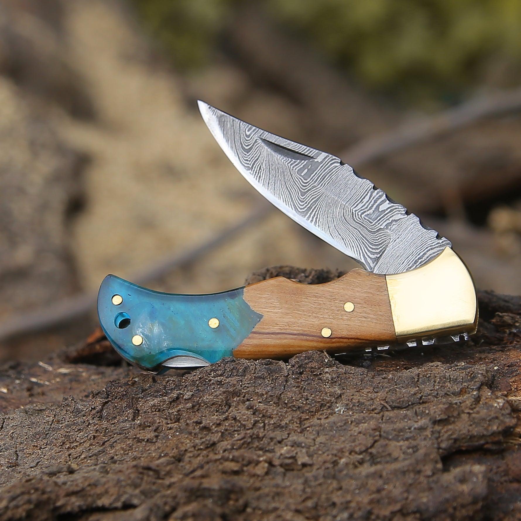 Knight Handmade Personalized Damascus Folding Hunting Knife - 7.6" Overall - Exotic Olive Wood & Turquoise Resin Scales, Under lock Pocket Knife with Hand Stitched Leather Sheath, Knife Sharpening, Spare Pocket Knife Sharpener & Personalized
