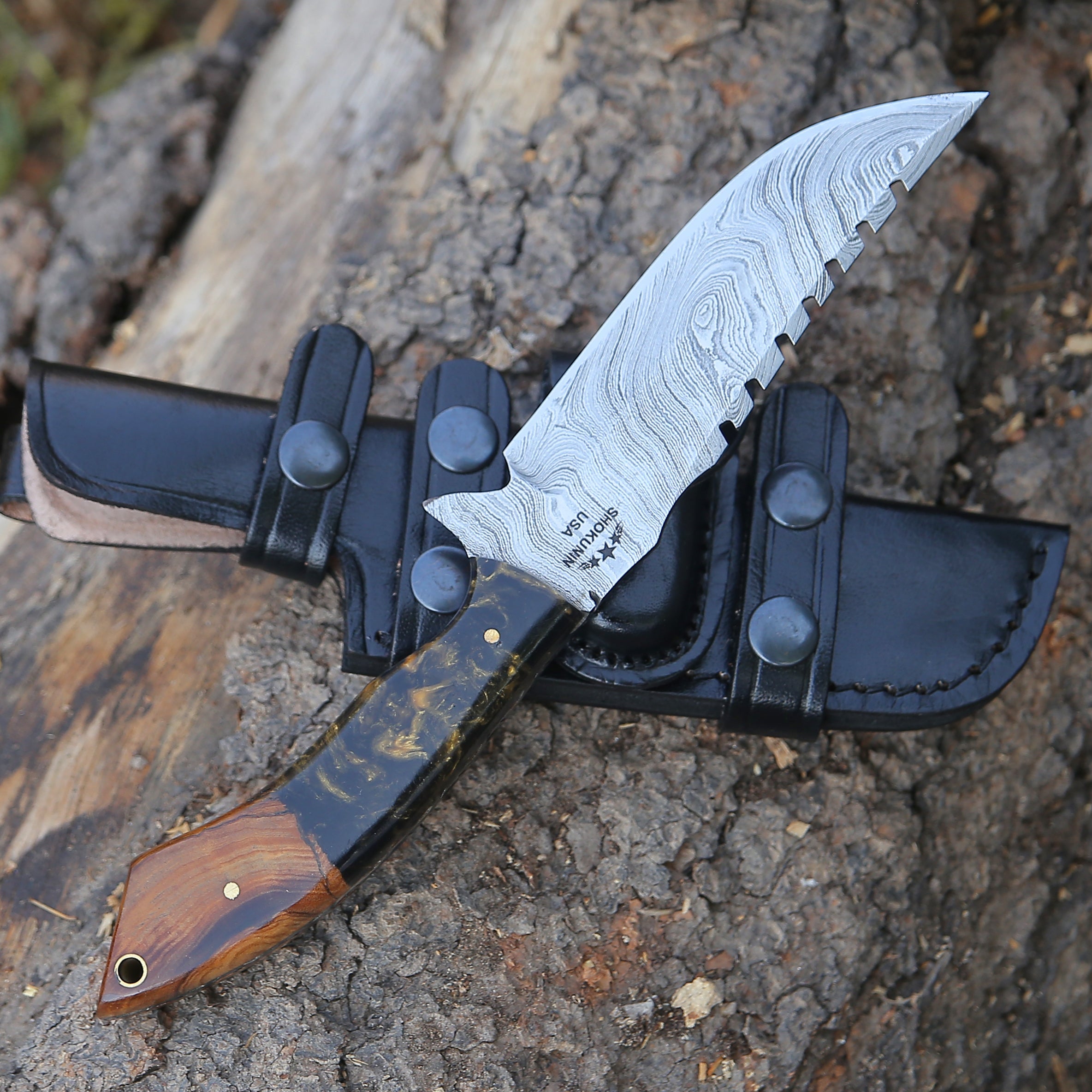 Morph Damascus Hunting/Skinning Knife, 10.0” Overall, 325 Layers Damascus Steel Clip Point Blade, Highly Figured Exotic Rosewood & Resin Handle, Hand Forged Fixed Blade, Full Tang, Hand Stitched Leather Sheath, Pro Knife Sharpening & Personalized