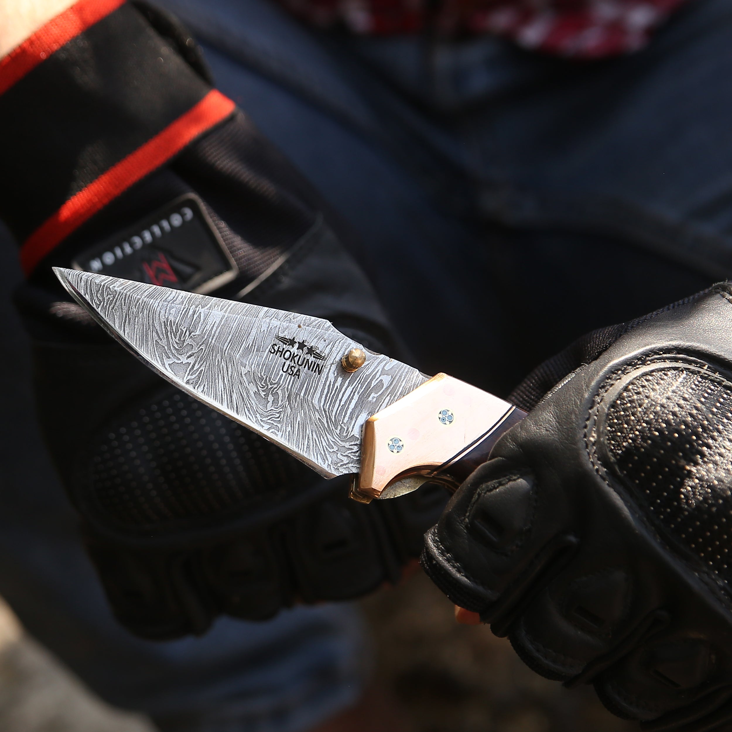 Mystic Handmade Damascus Folding Hunting Knife, 7.5” Overall, 325 Layers Damascus Steel Clip Point Blade, Highly Figured Exotic Rose Wood & Mother of Pearl Handle, Copper Guard & Accents, Hand Forged Fixed Blade, Full Tang, Hand Stitched Leather Sheath, Pro Knife Sharpening & Personalized