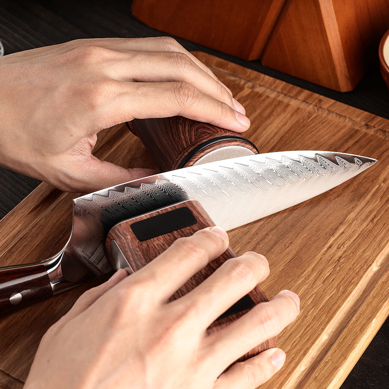 Crafted for both beginners and culinary experts, the Shokunin USA sharpener delivers an impeccable edge with each use. Choose your angle, and let the blade glide effortlessly along the rolling disc for a quick and straightforward sharpening process.