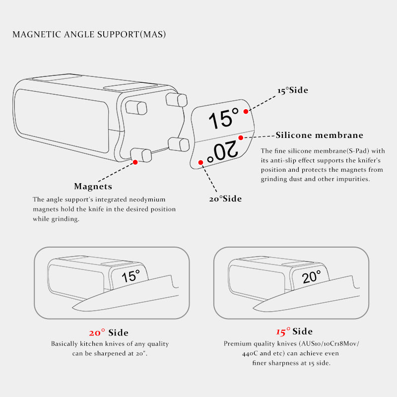 Our tool allows for the sharpening of both traditional and specialty blades with minimal effort. Integrated powerful magnets ensure your knife maintains a consistent 20° or 15° angle, providing a uniform sharpness along the entire edge.