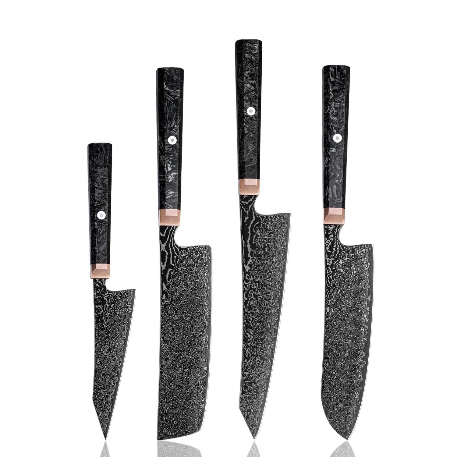 Raven Japanese Knife Set, 4 - Pcs, Handmade VG10 Damascus Steel Blades with Carbon Fiber Handle and Copper Bolster, Brass Mosaic Pins, Custom Full Tang Fixed Blade Professional Kitchen Knife Set with Sheath, Knife Sharpening and Custom Personalization